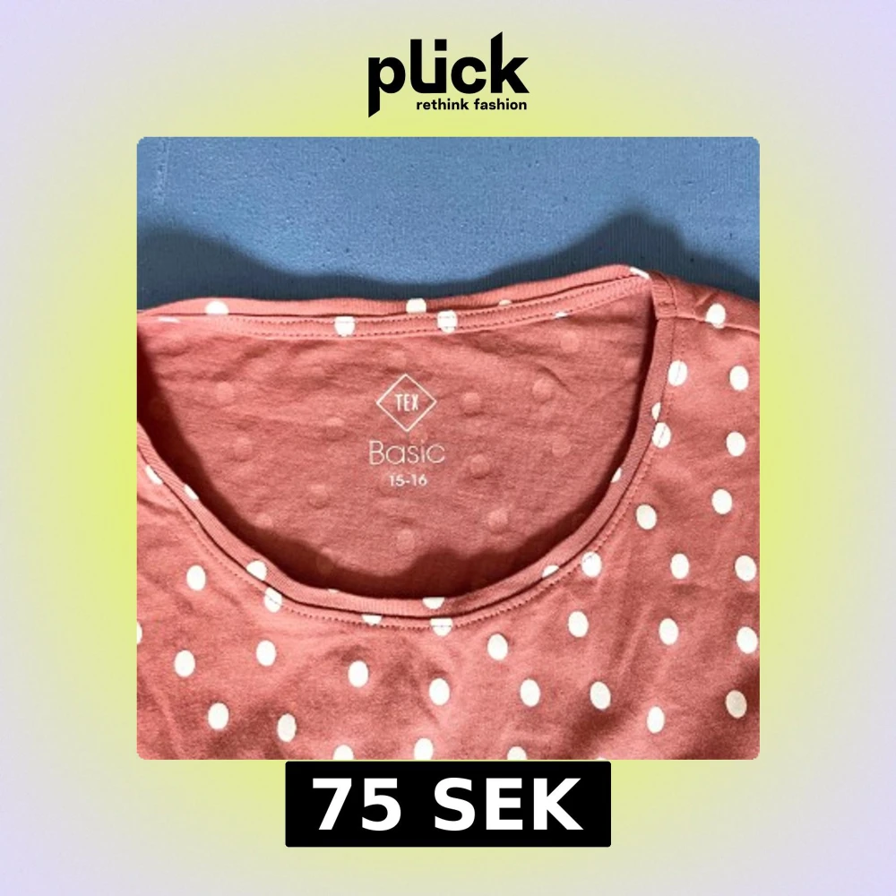 Söt röd klänning med vita prickar från Tex. Klänningen har långa ärmar och en rund halsringning, perfekt för en avslappnad stil. Storlek 15-16.