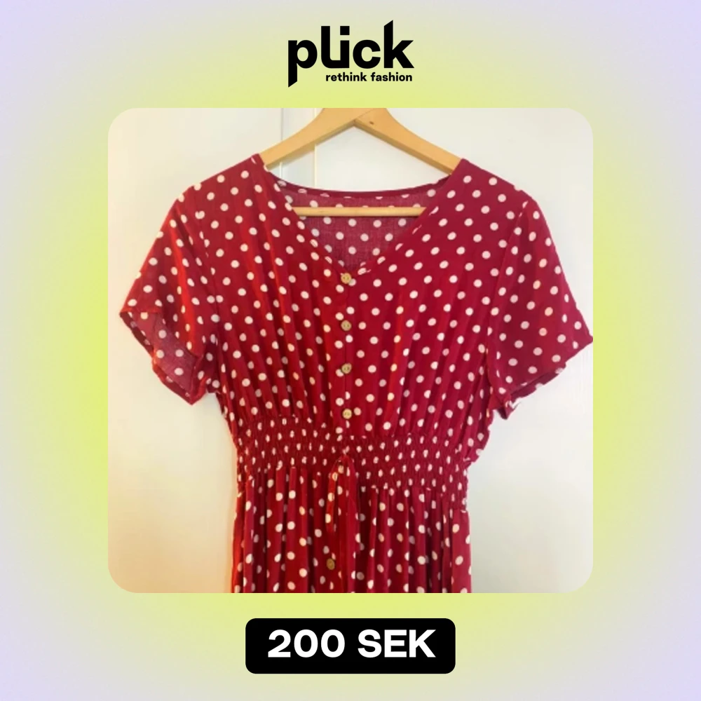 Säljer en superfin röd långklänning med vita prickar. Klänningen har korta ärmar och en smickrande v-ringad hals. Den har knappar framtill och en elastisk midja som ger en bekväm passform. Asymmetrisk kjol som är längre baktill än framtill. Perfekt för sommarens alla fester och tillfällen! 🌸
