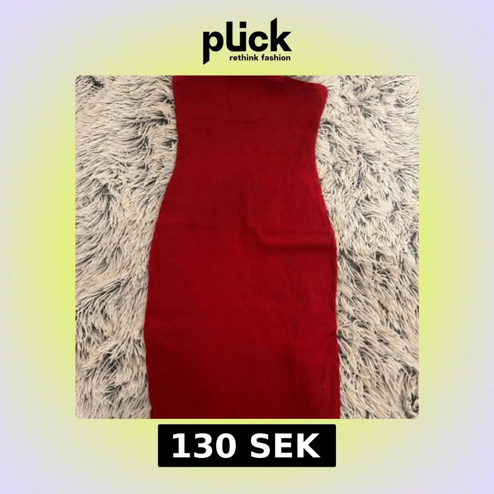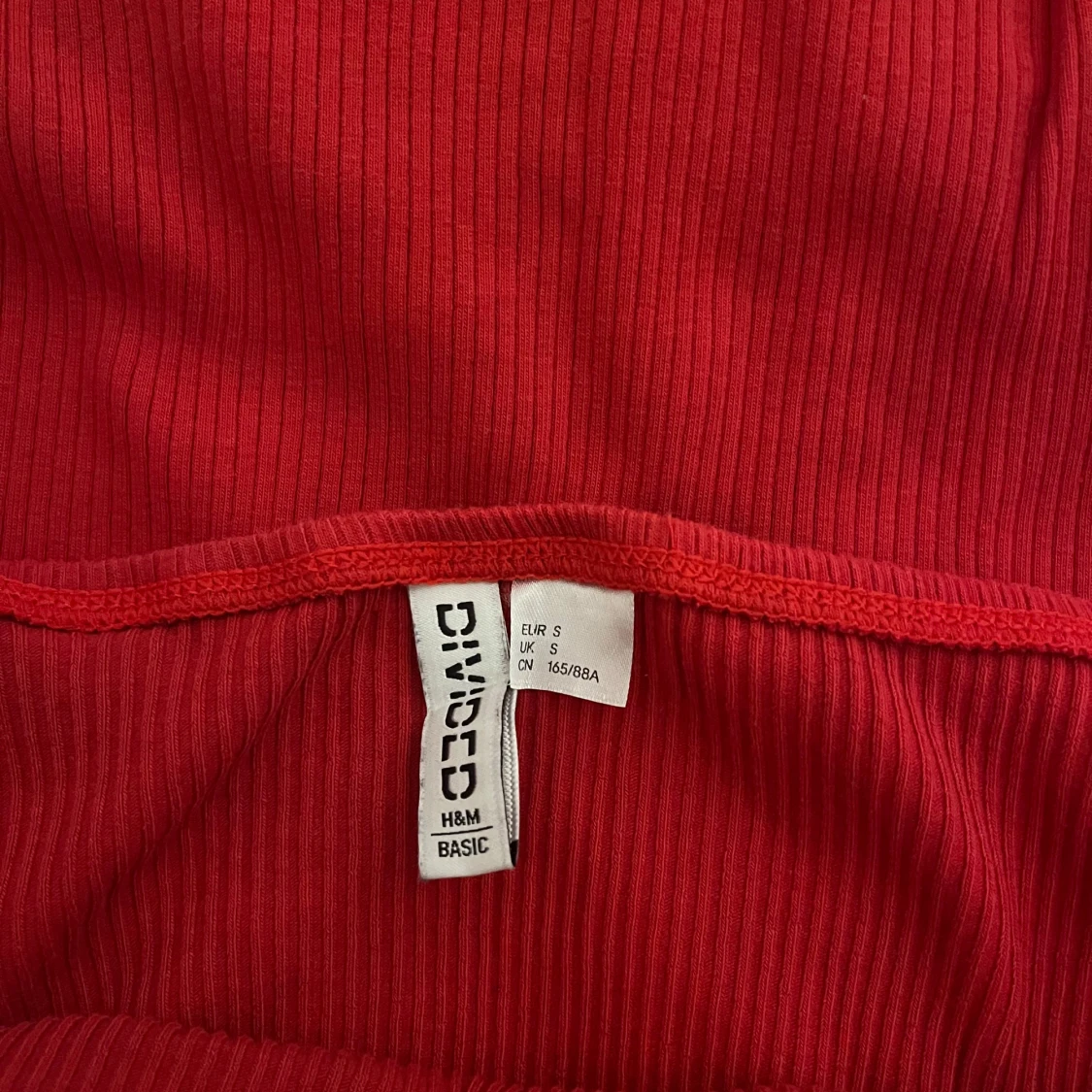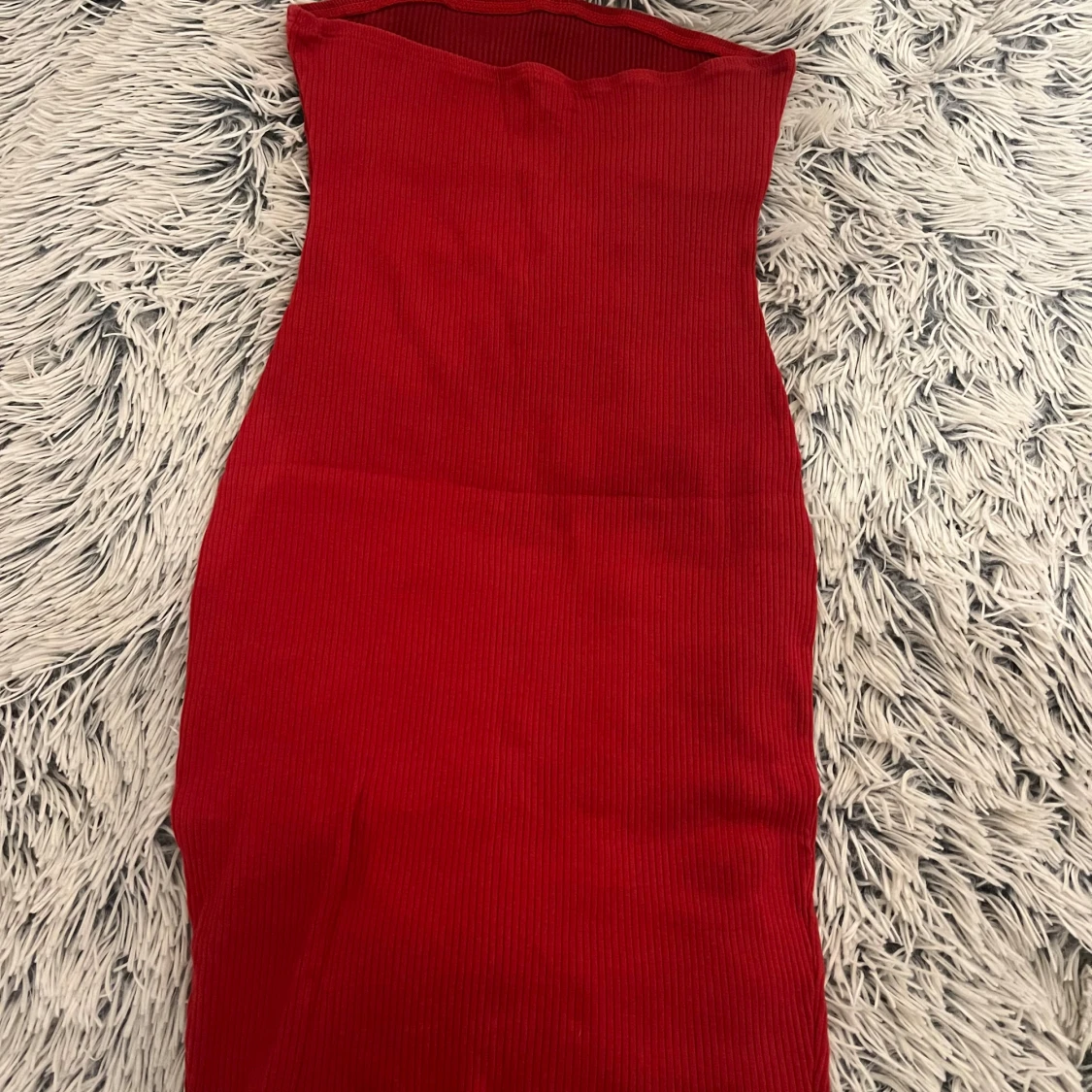Snygg röd ribbad klänning från H&M med en tight passform. Perfekt för en stilren look. Klänningen är axelbandslös och har en enkel design som gör den lätt att matcha med olika accessoarer.