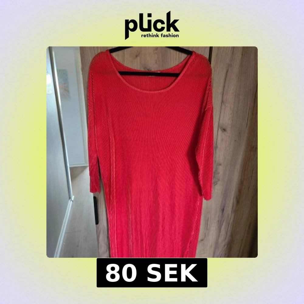 Säljer en röd långklänning med rund halsringning och långa ärmar. Klänningen har en ribbad struktur som ger en snygg och modern känsla. Perfekt för dig som gillar enkel men stilren design.