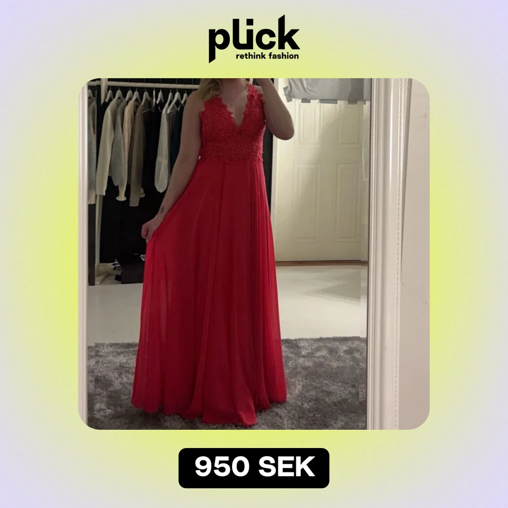 Säljer en röd/rosa långklänning med vackra spetsdetaljer och djup v-ringning. Klänningen har en elegant öppen rygg och är perfekt för festliga tillfällen. Materialet är mjukt och flödande, vilket ger en fin passform. Perfekt för bal!🥳