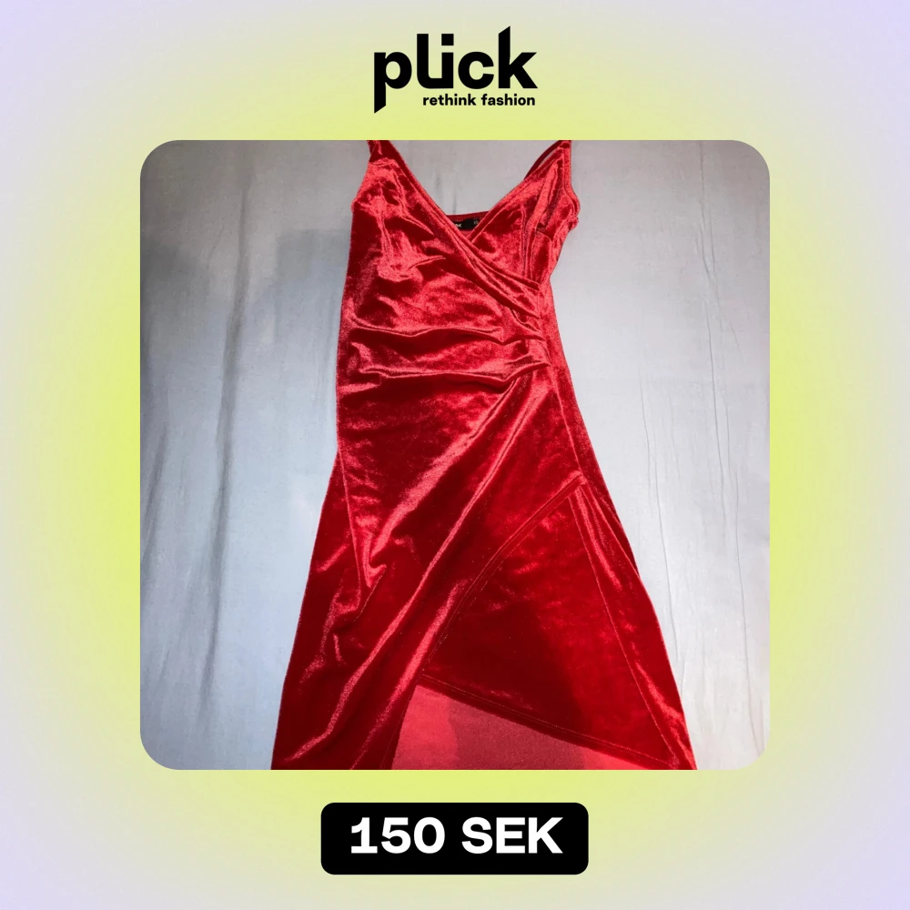 Säljer en superfin röd klänning från BikBok i mjuk sammet. Den har en omlott-design med en snygg slits framtill. Perfekt för festliga tillfällen! Klänningen är ärmlös och har en v-ringad halslinje som ger en elegant touch. Använd en gång.
