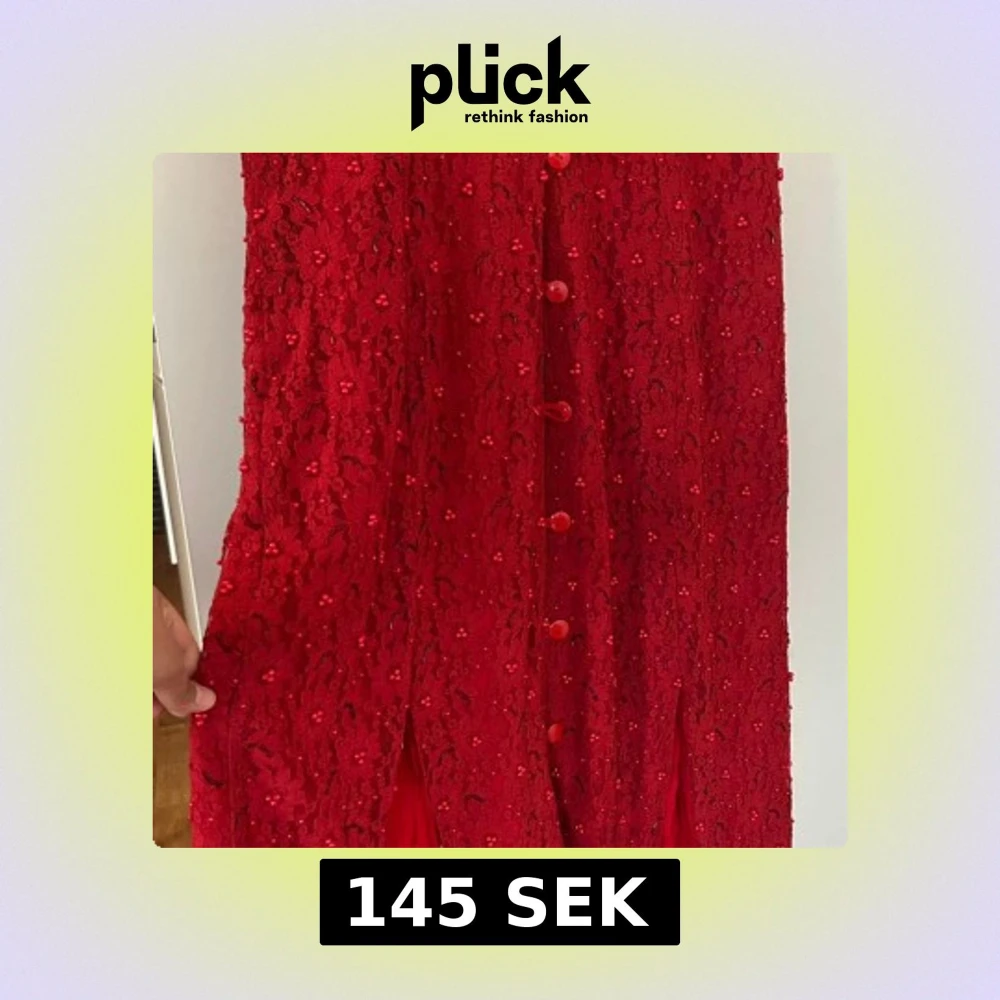 Snygg röd långklänning från Capricci med blommig spets, pärldetaljer och knappar framtill. Ärmlös modell med lätt utställd passform och fodrad insida. Perfekt för dig som vill sticka ut med en unik och elegant look.