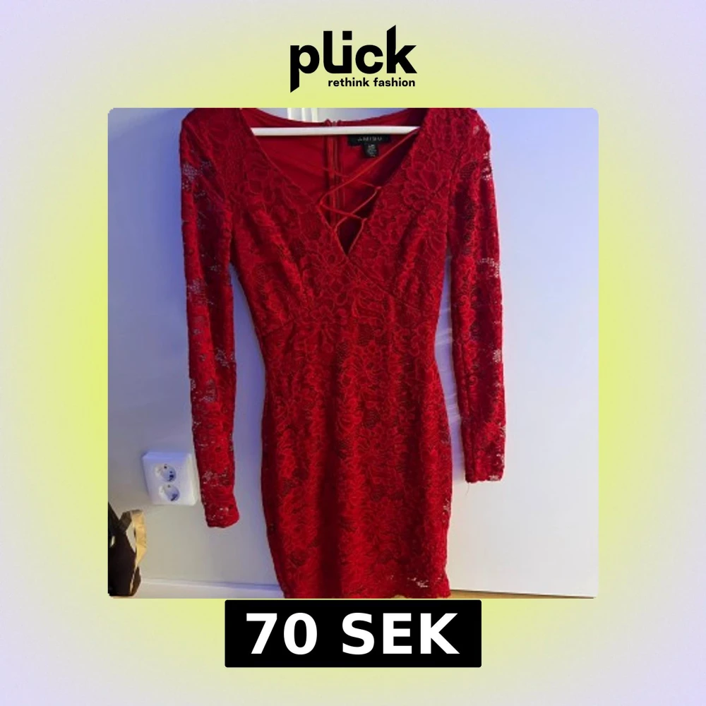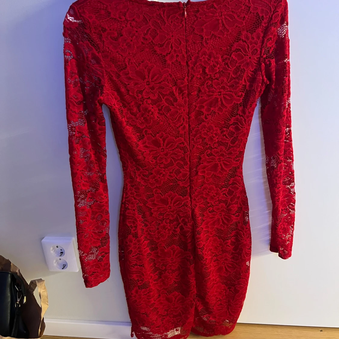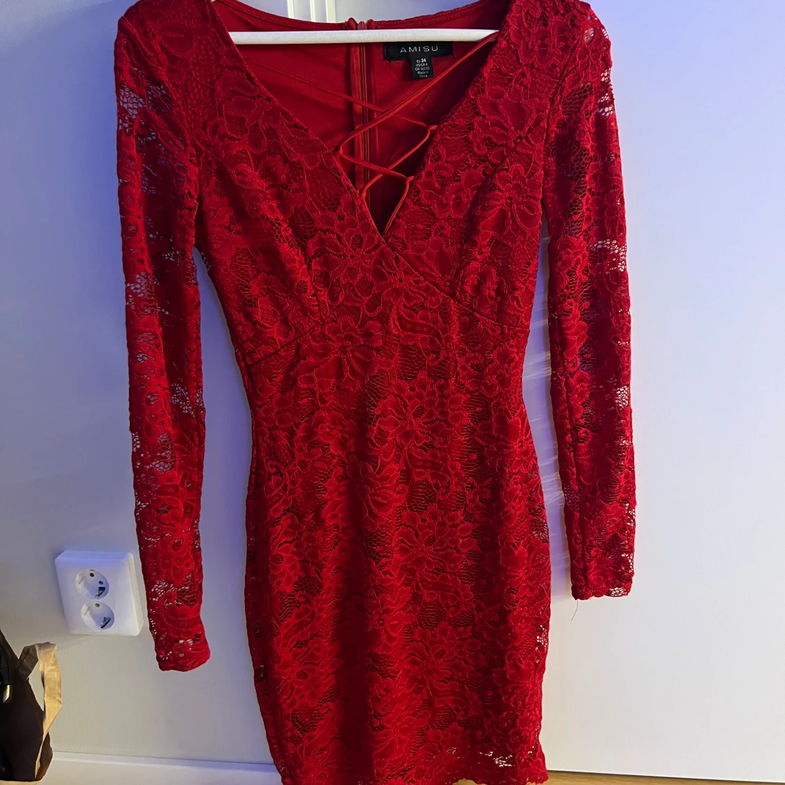 Säljer en röd kort klänning med långärmade ärmar och snygg snörning framtill. Klänningen har ett blommigt spetsmönster och figurnära passform. Perfekt för dig som vill sticka ut med en elegant look och djup v-ringning.