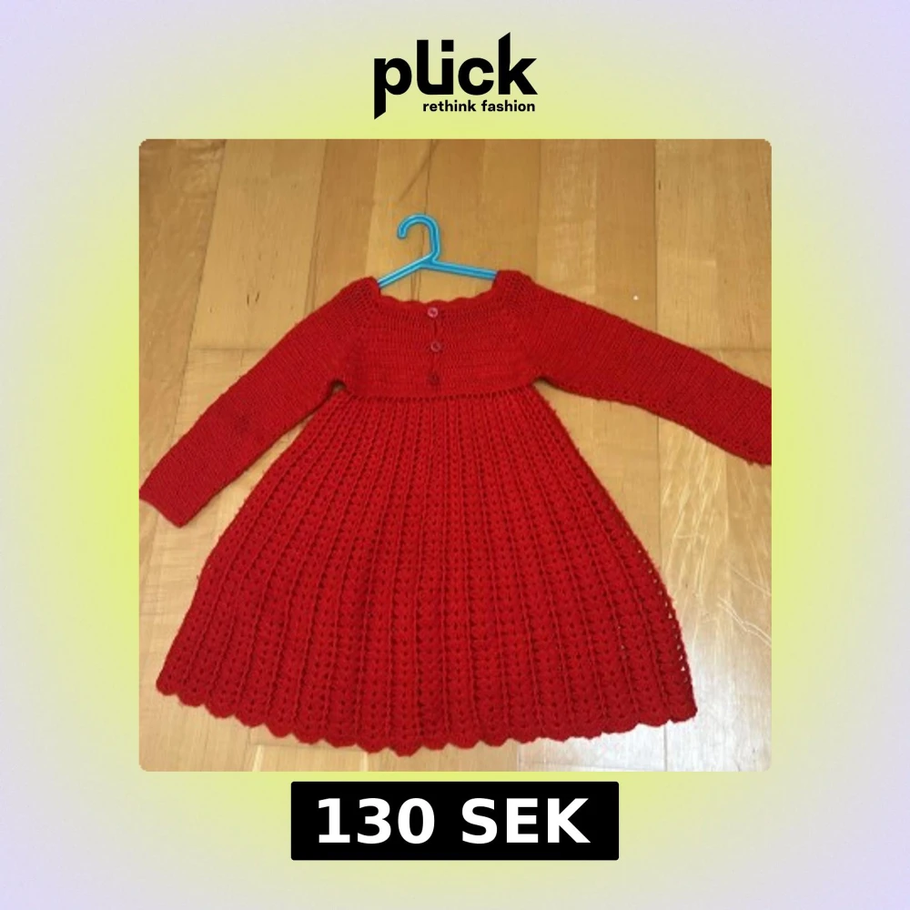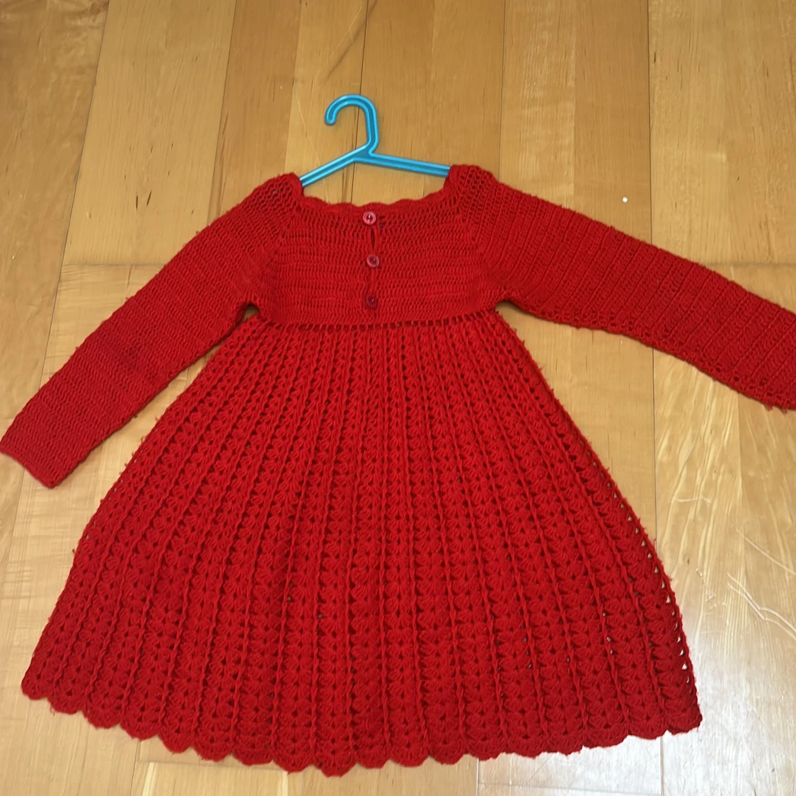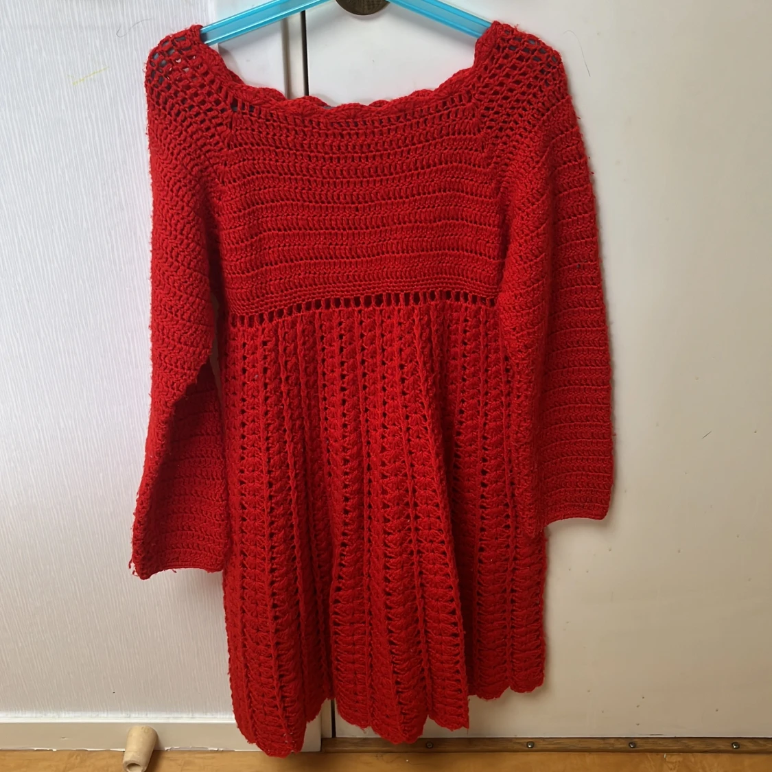Säljer en röd stickad långklänning med snyggt virkat mönster och tre knappar framtill. Klänningen har långärmade ärmar och en rundad hals med vågig kant. Perfekt för dig som gillar unika och handgjorda plagg med cozy vibes.