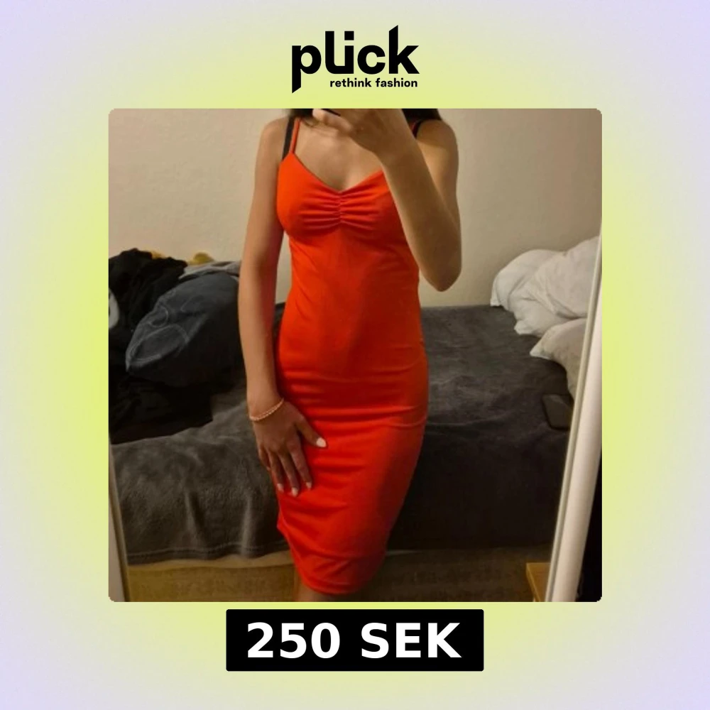 Säljer en röd, figurnära klänning med smala axelband och snygg rynkdetalj vid bysten. Klänningen är knälång och har en enkel, stilren design som framhäver siluetten. Perfekt för dig som gillar en minimalistisk men ändå iögonfallande look.