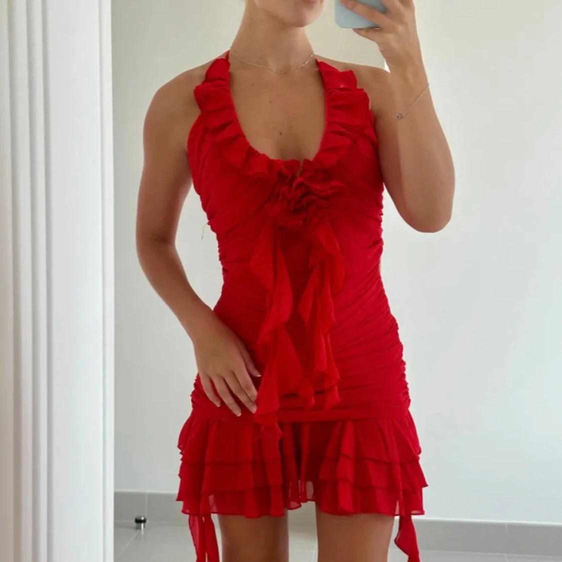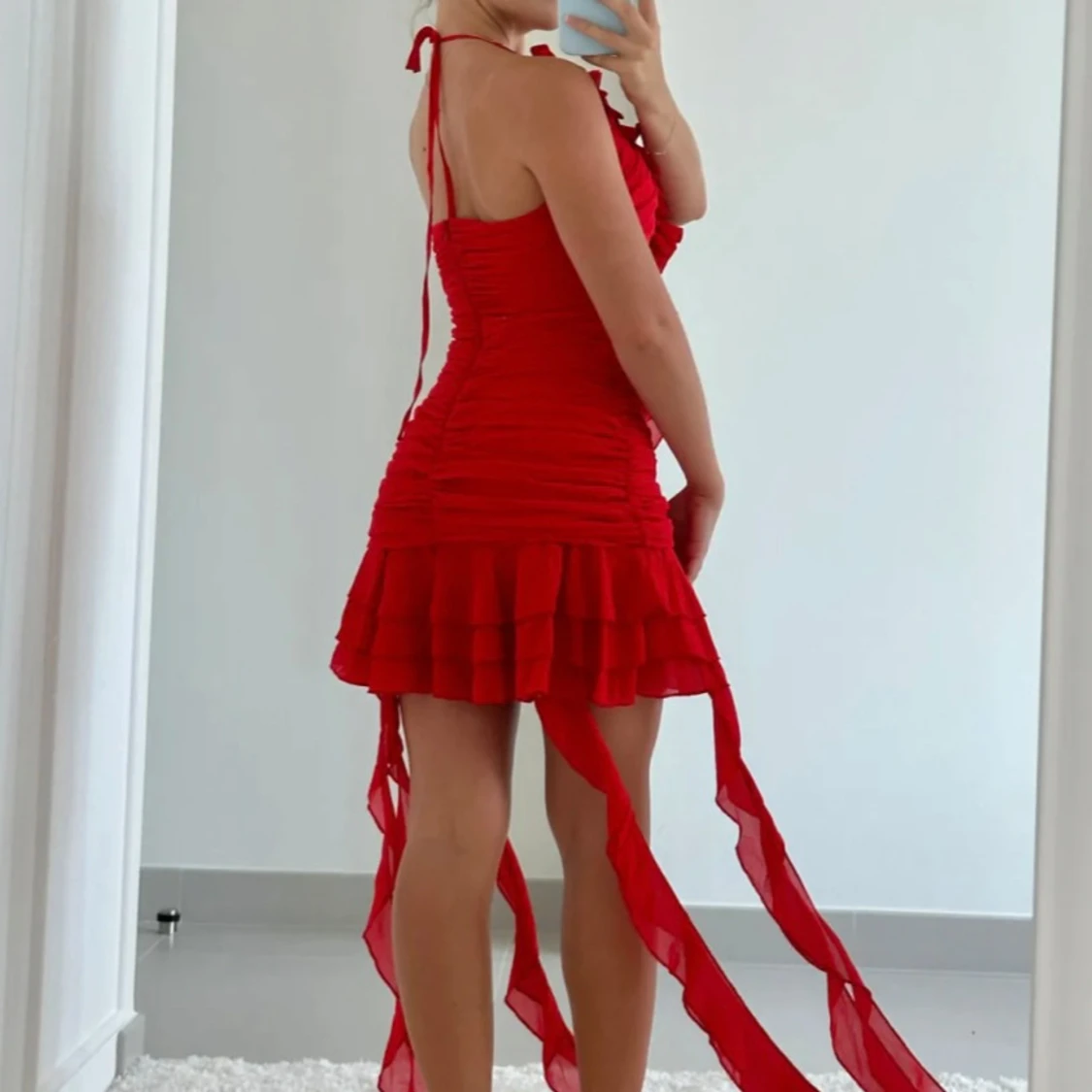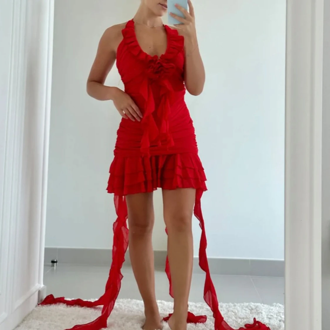 Supersnygg röd kortklänning med volanger och djup v-ringning. Klänningen har snörning i halsen och långa band som hänger ner, samt flera lager volanger i kjolen. Perfekt för dig som vill sticka ut och älskar statement-plagg. Bilden är lånat!
