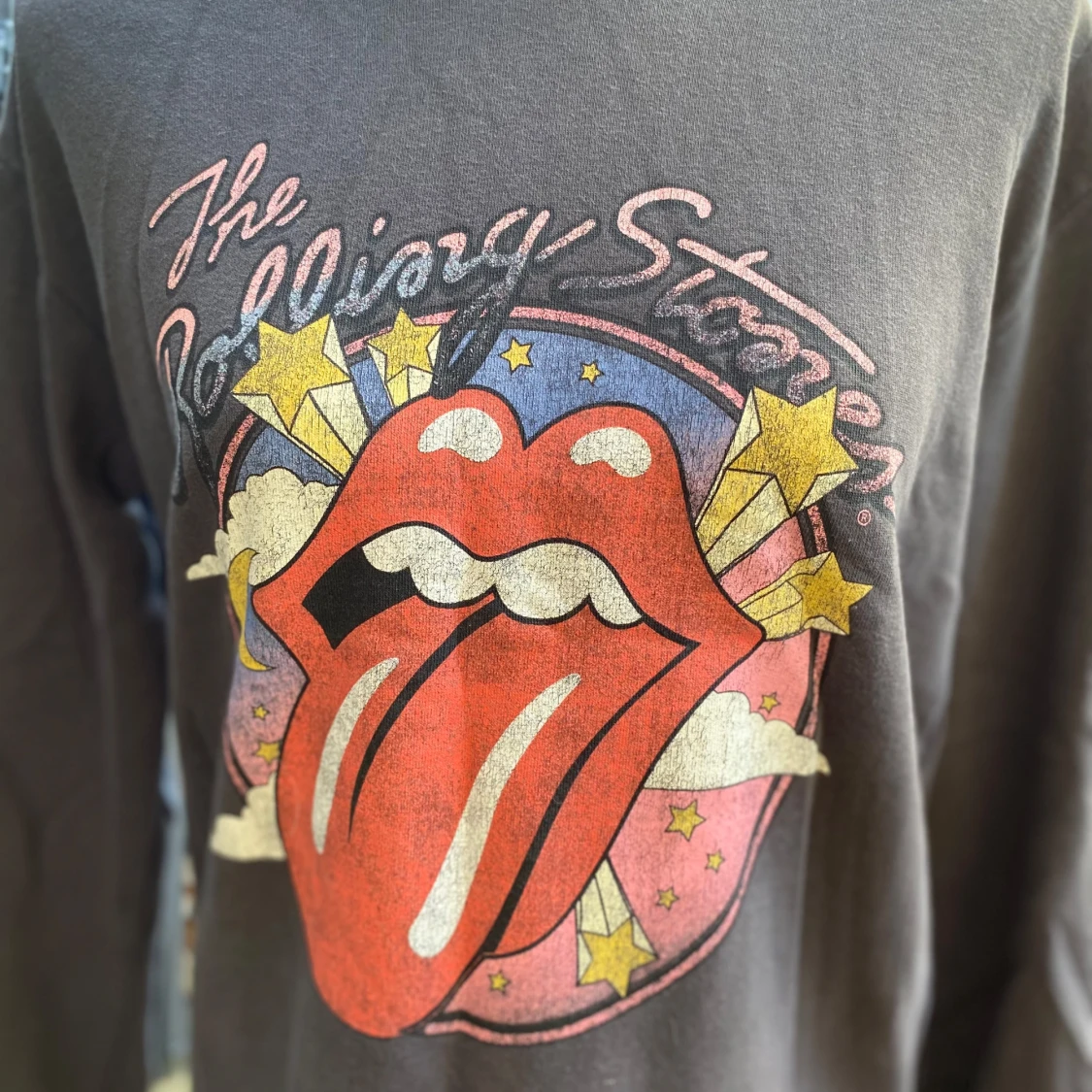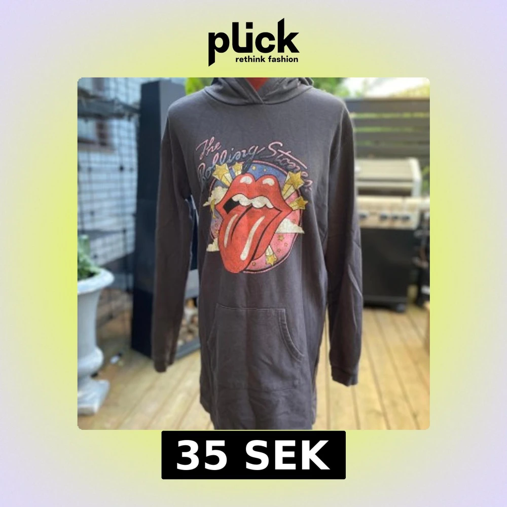 Svart hoodie från H&M med Rolling Stones-tryck framtill. Tröjan har huva, lång ärm och en stor magficka. Materialet är mjukt och skönt, perfekt för dig som gillar bandmerch och streetstyle. Snyggt tryck med tungan och stjärnor i rött, gult och blått.