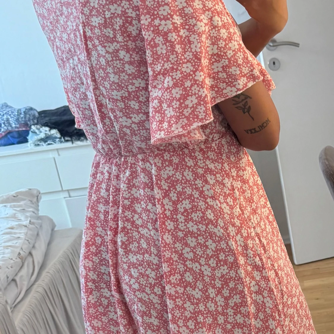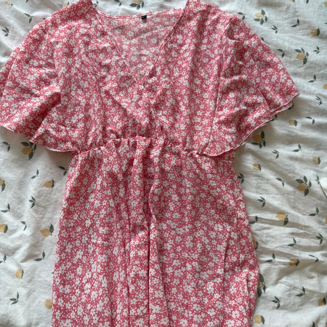 Supersöt rosa kortklänning med vitt blommönster och v-ringning. Klänningen har korta, vida ärmar och resår i midjan för en skön passform. Perfekt för varma dagar och ger en fräsch, somrig vibe!