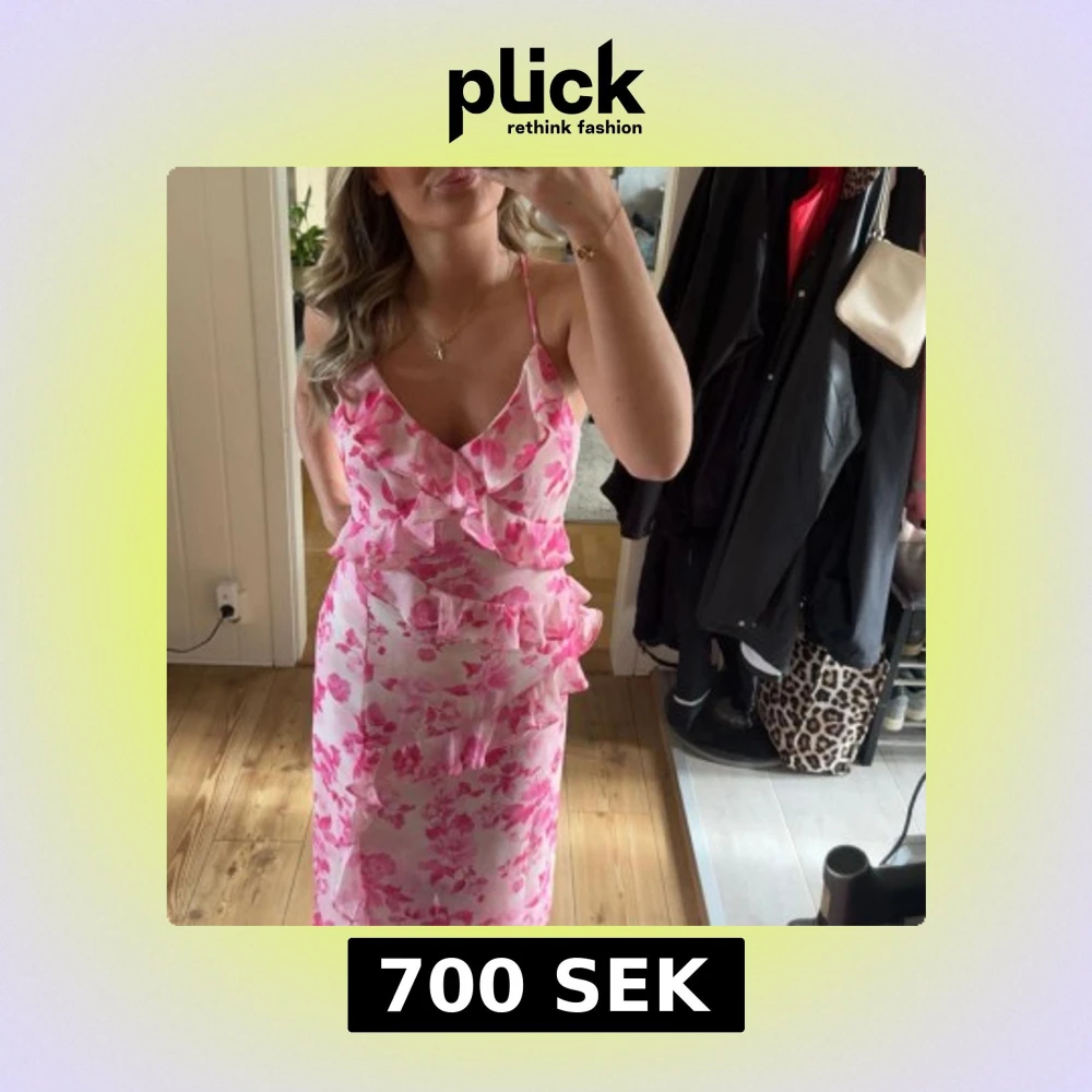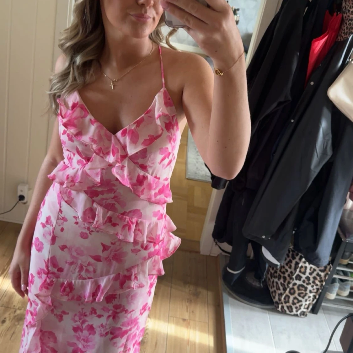 Superfin långklänning i ljusrosa och vitt med blommigt mönster och volangdetaljer. Klänningen har smala axelband, v-ringning och öppen rygg med knyt. Perfekt för sommarens och semestrarnas alla tillfällen när du vill sticka ut lite extra!!🩷Oanvänd och prislapp kvar