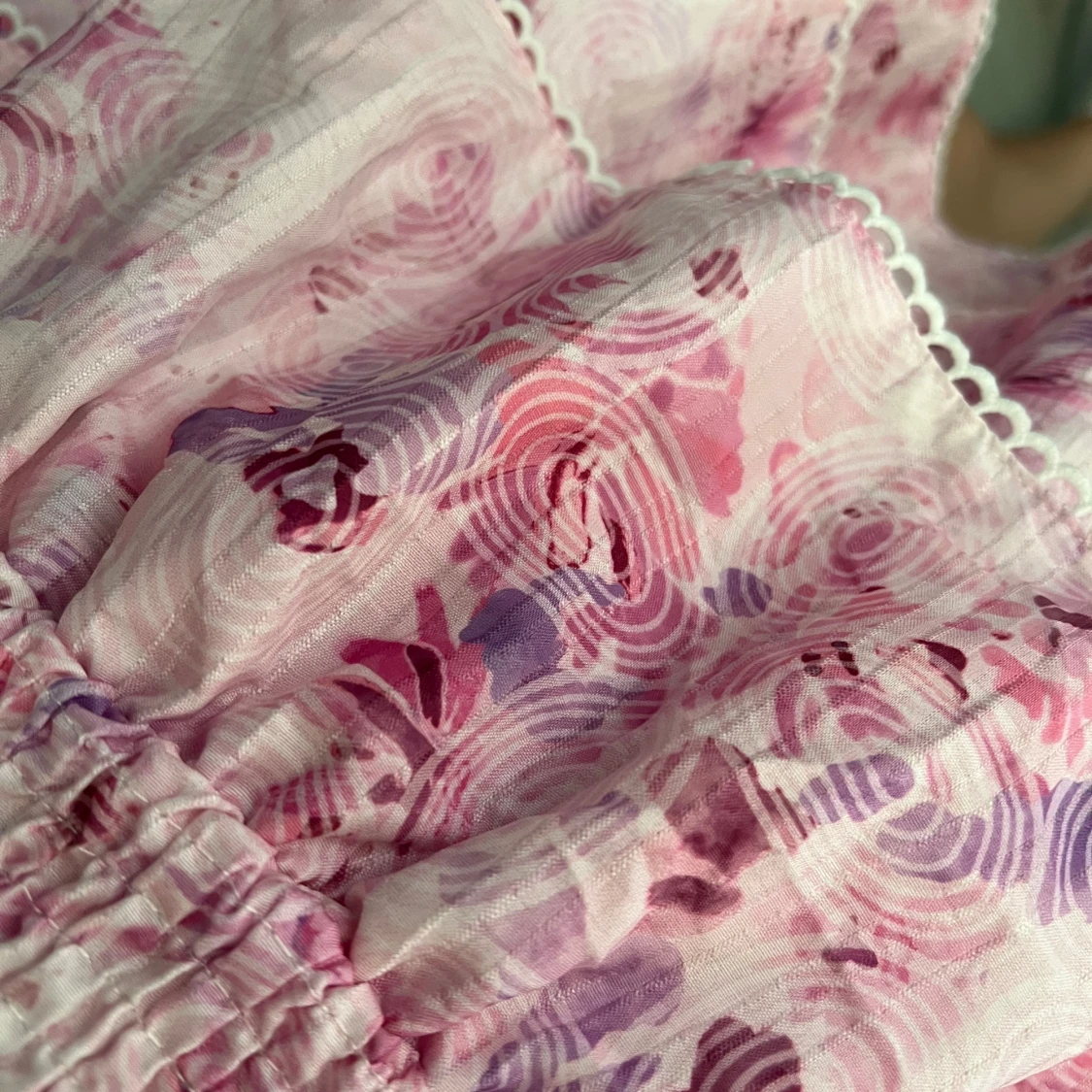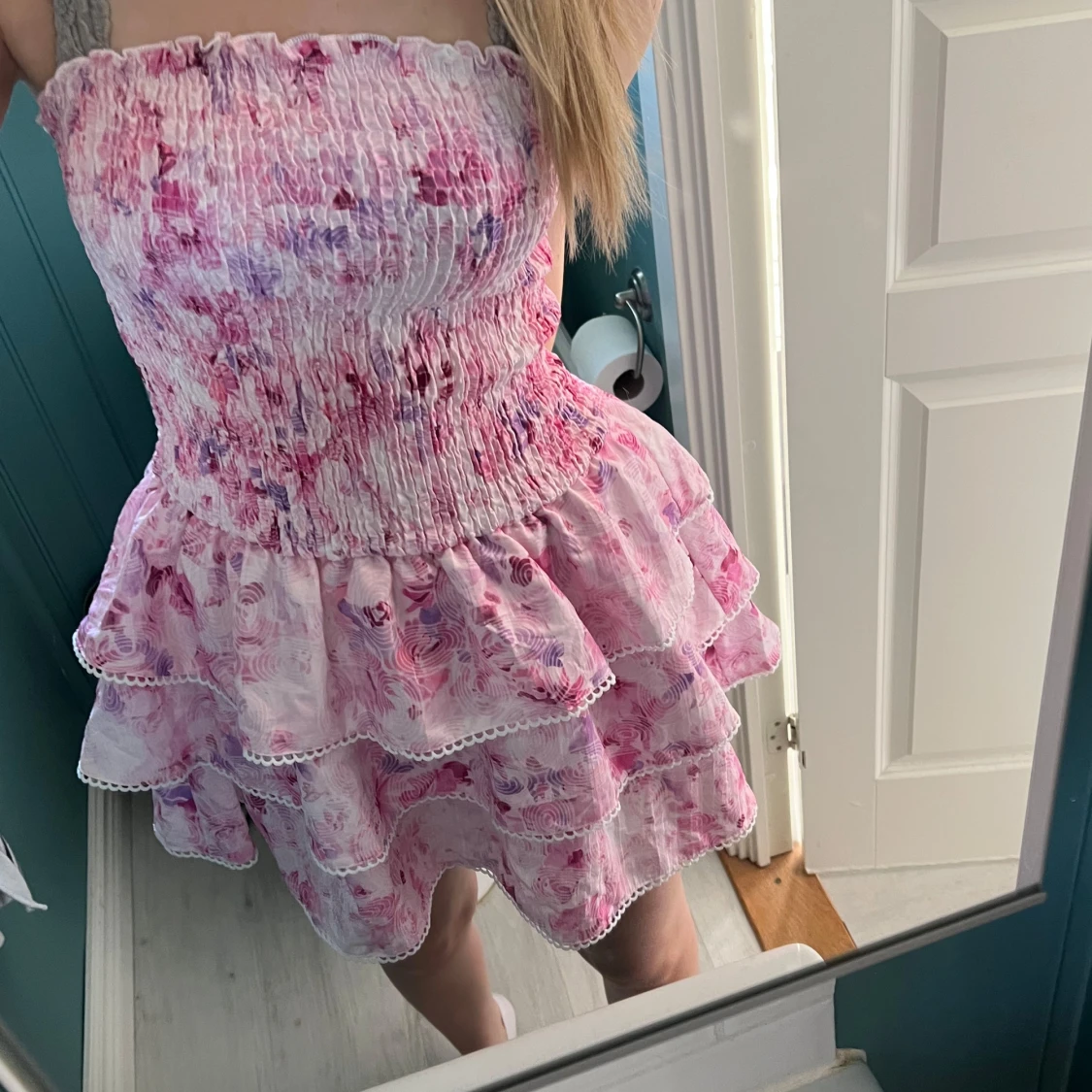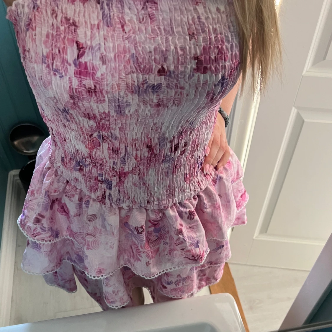 Trendig klänning🤩Skulle säga att den passar som S/M!💗 Supersöt kort klänning i rosa och lila toner med blommigt mönster. Axelbandslös modell med smock upptill och flera volanger i kjolen. Tunt, lätt material som känns perfekt för varma dagar. Söt spetskant längs volangerna för extra detalj.
