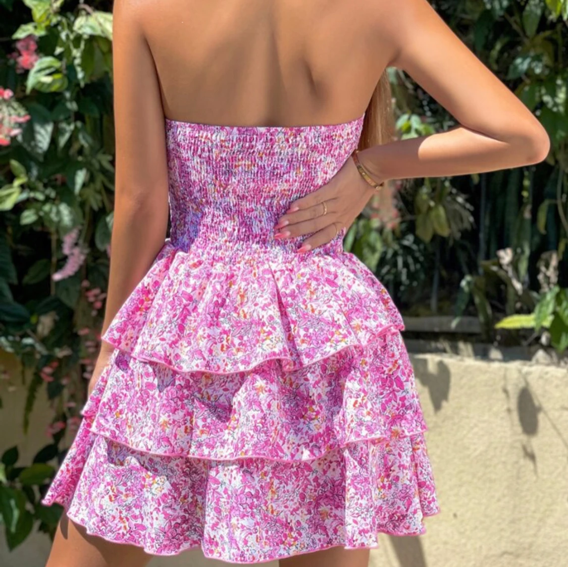 Supersöt kort klänning med rosa och vita blommor, volanger i flera lager och smockad midja. Omlott-detalj framtill med cut-out och halterneck. Perfekt för sommardagar när du vill sticka ut lite extra. Köpt på shein, är oanvänd!