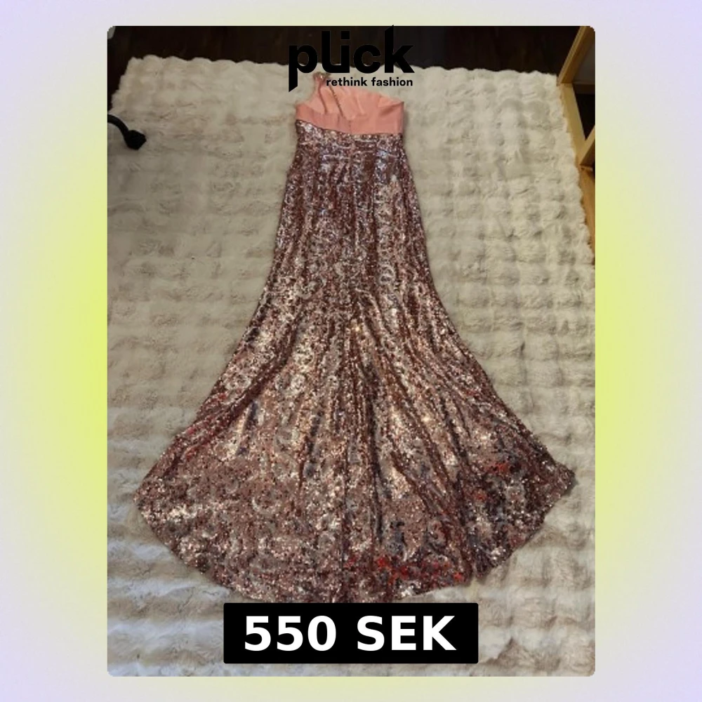 Rosa, enaxlad långklänning med paljetter och en dekorativ detalj på axeln. Klänningen har en dragkedja baktill och utsvängd kjol som fäller ut i ett lätt släp baktill. Några av de stenar som är på axeln sitter löst men man kan enkelt sy de fast. Klänningen är kemtvättad men trots det så finns pyttesmå fläckar inifrån se bild som påverkar inte alls utseendet på klänningen.