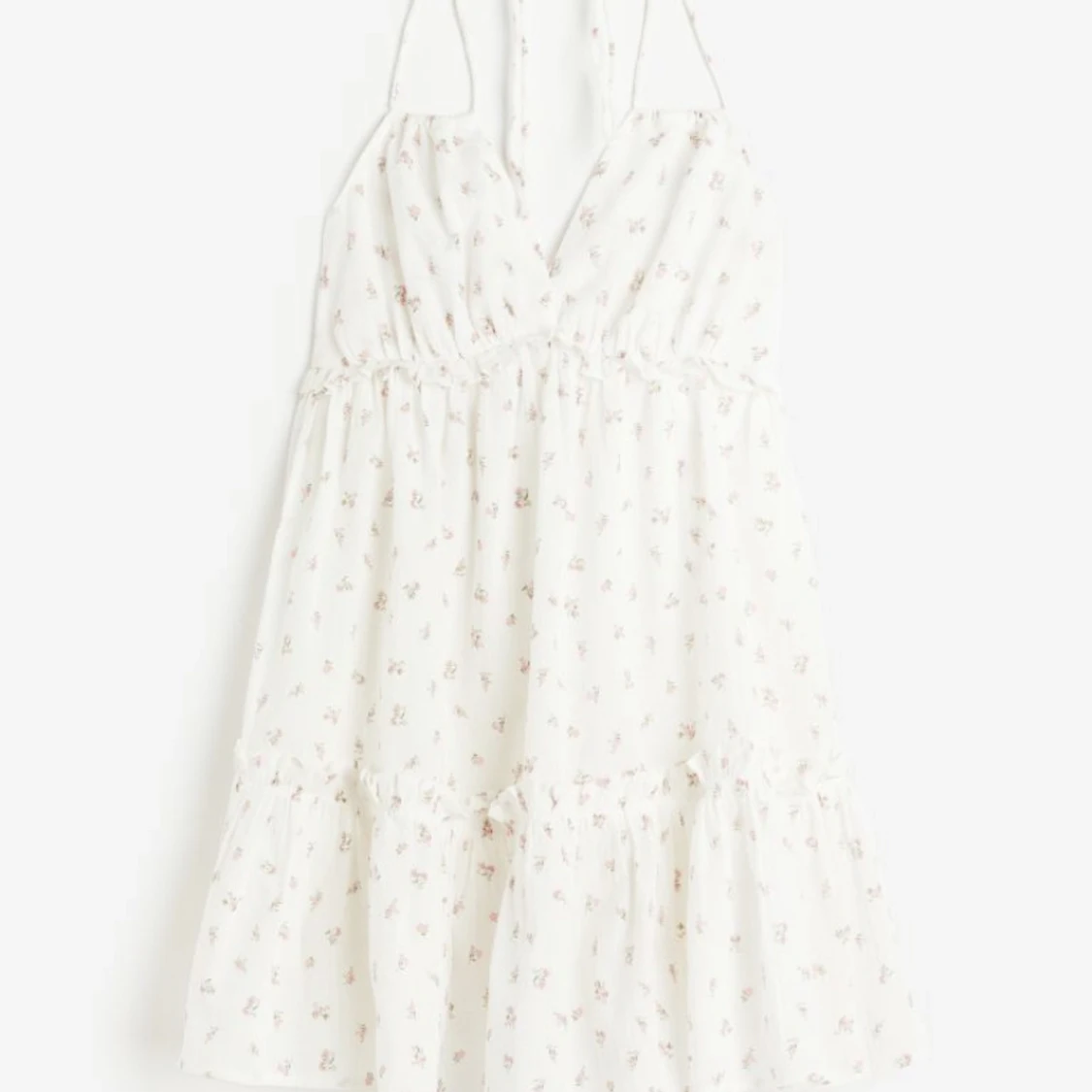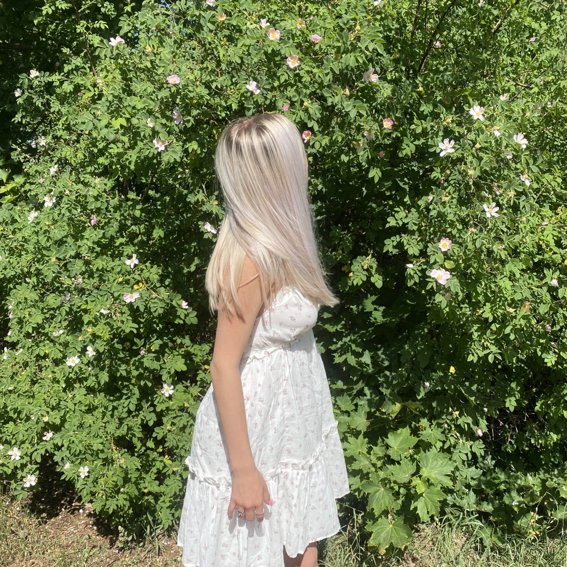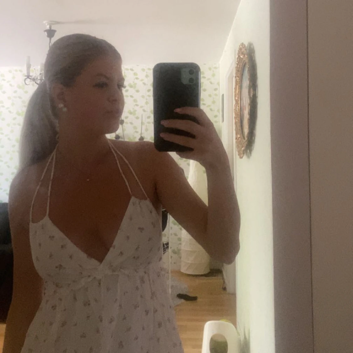 En jätte fin blommig klänning, tyvärr använde ja bara den 2 gånger då den inte kom till användning. Super bra skick🫶🏽den är vit med små rosa blommor på. Man knyter själv snörningen så man väljer själv hur klänningen ska sitta på.