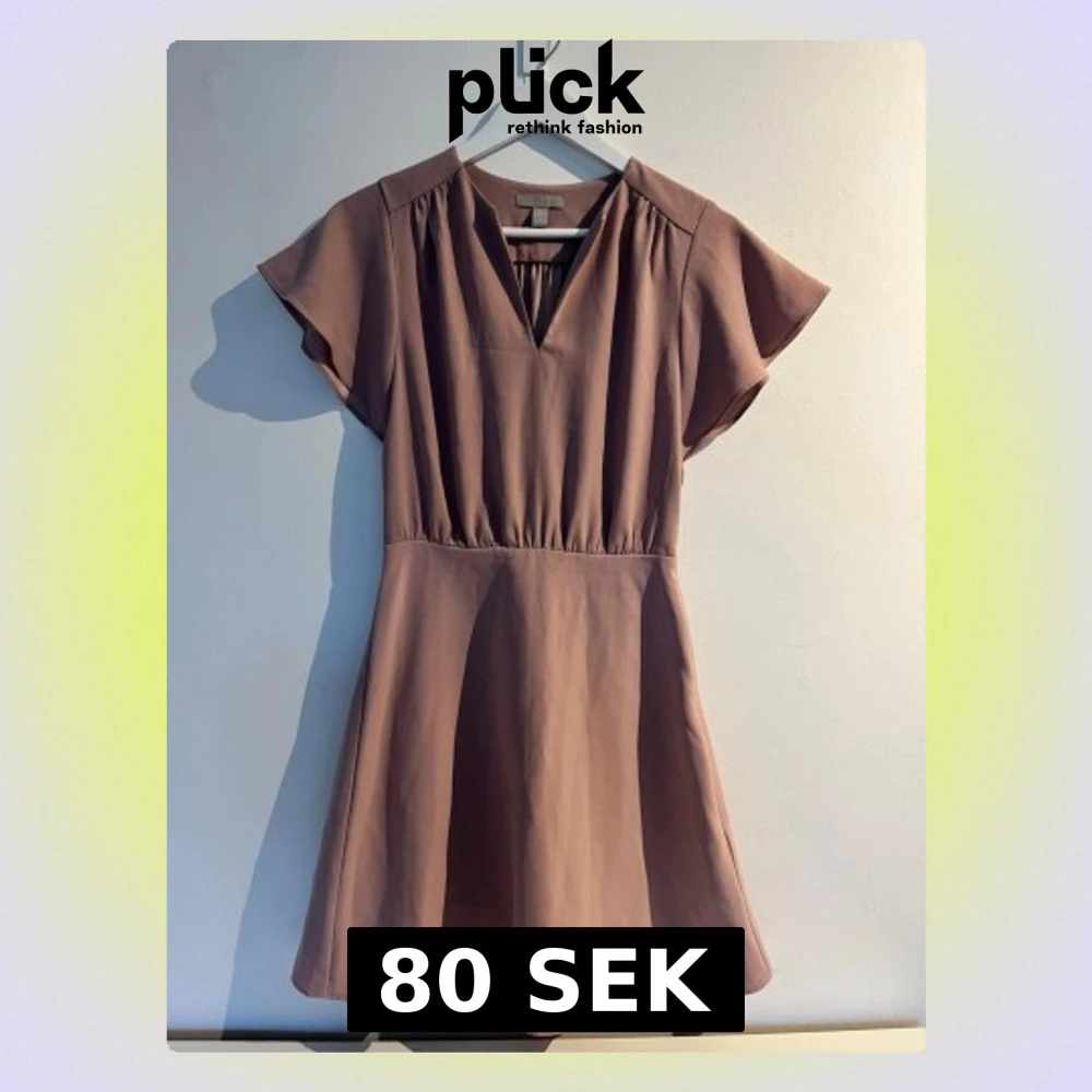Kortklänning i rosa med v-ringad hals och korta ärmar. Klänningen har en markerad midja och lätt utställd kjol. Storlek: 34