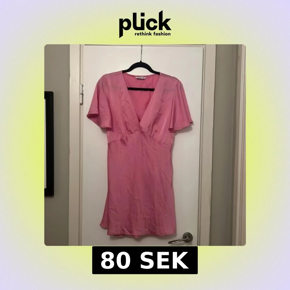 Snygg rosa klänning från Stradivarius med v-ringning och korta ärmar. Perfekt för en somrig look. Klänningen har en smickrande passform och är tillverkad i ett lätt material.