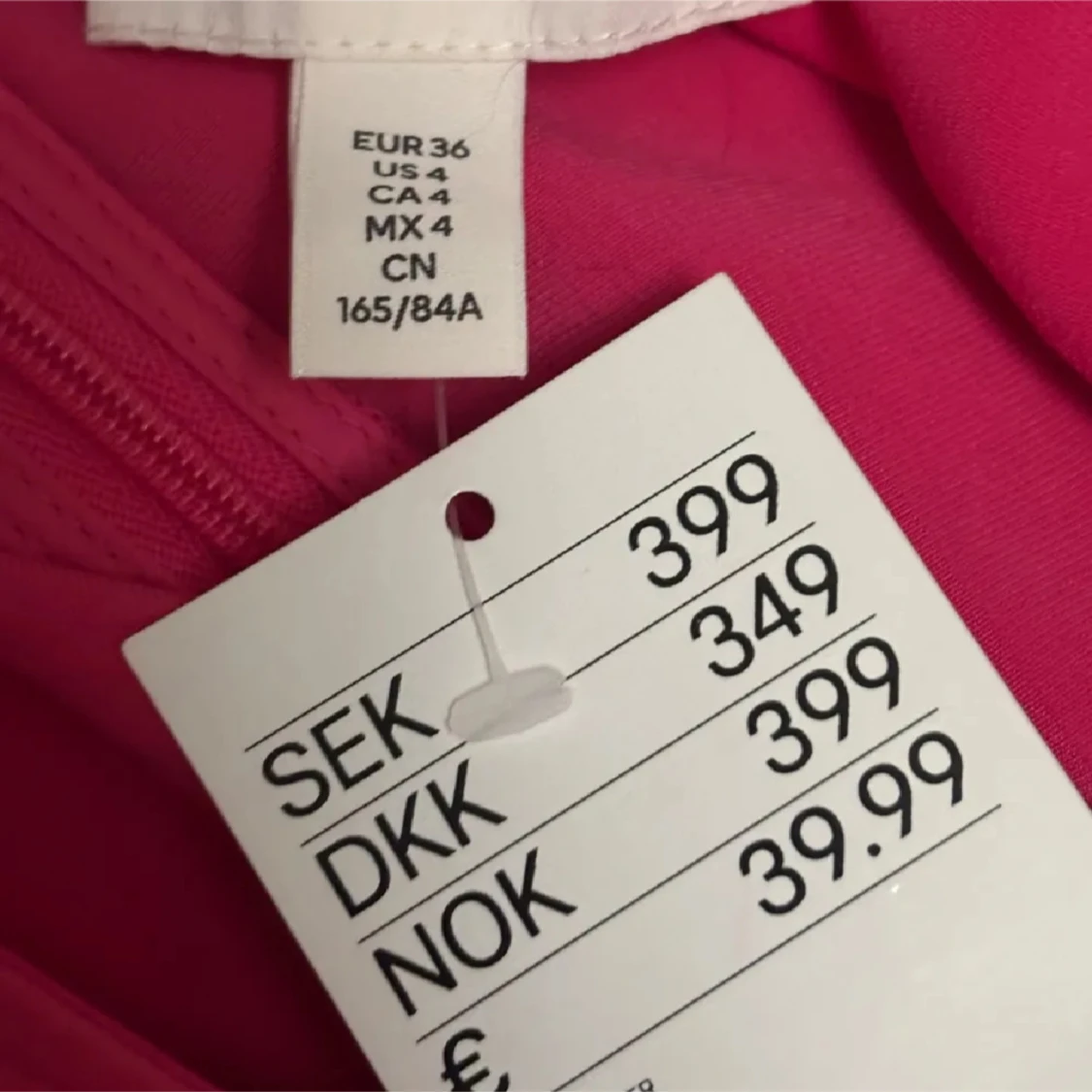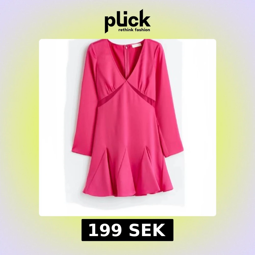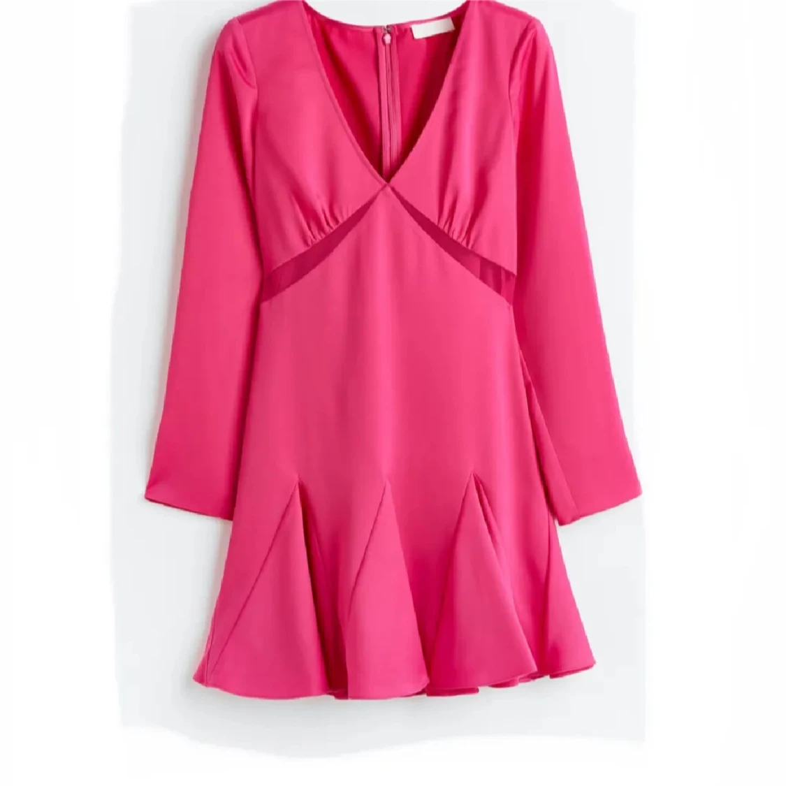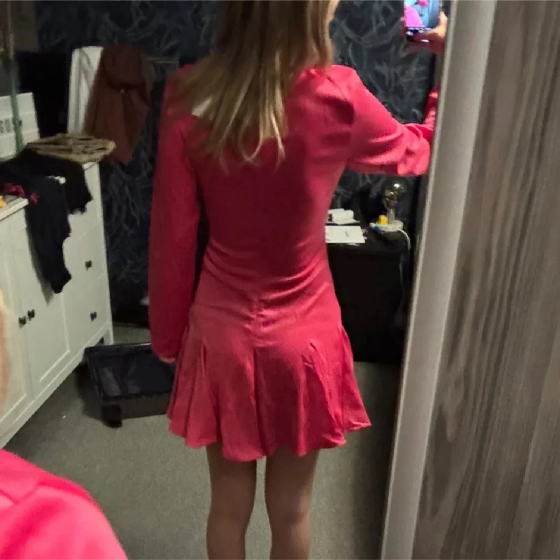 Supersnygg rosa kortklänning med v-ringning och långa ärmar. Klänningen har markerad midja och coola veckade detaljer i kjolen som ger extra volym. Tillverkad i ett lätt, glansigt material som känns lyxigt. Perfekt för dig som vill sticka ut med färg! Under bysten är det lite genomskinligt tyg vilket jag tycker är skitsnyggt! Den har aldrig kommit till användning tyvärr eftersom den är väldigt fin!