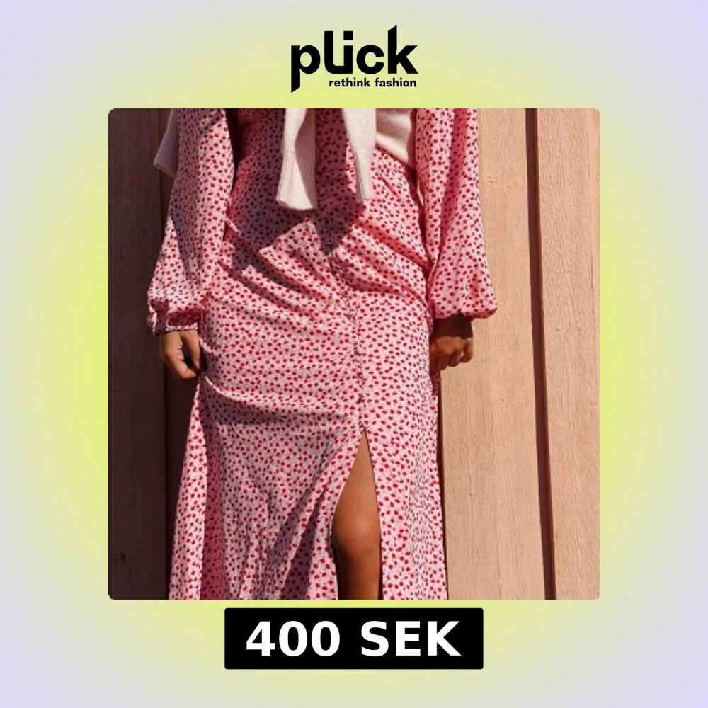 Supersöt rosa långklänning med små röda blommor 💕 klänningen är intagen i midjan och har en resår baktill