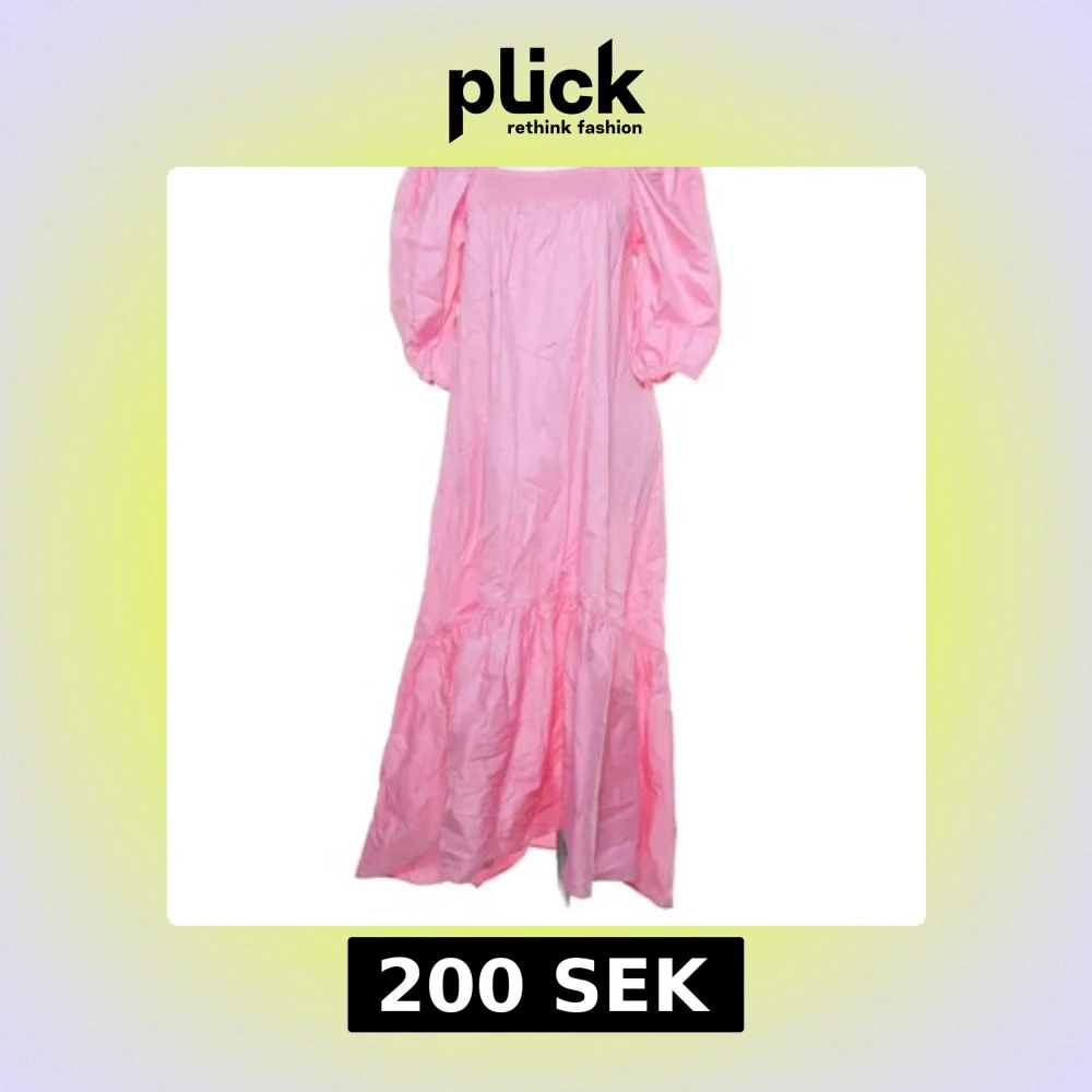 Charmig rosa långklänning från H&M med puffiga trekvartsärmar och en volangdetalj vid fållen.