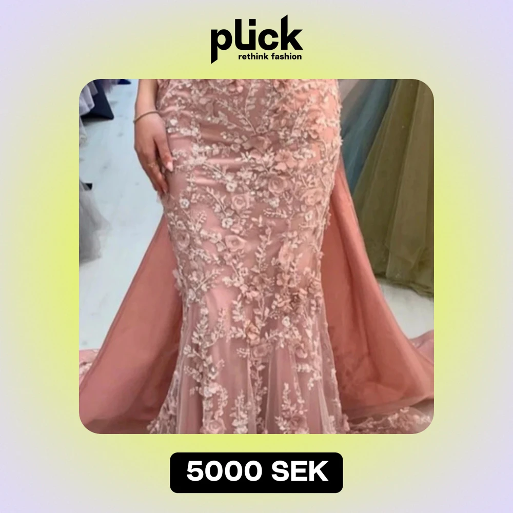 Fantastisk rosa långklänning med vackra spetsdetaljer och blommönster. Klänningen har en elegant slits och är perfekt för festliga tillfällen. Materialet är troligtvis satin vilket ger en lyxig känsla. Passformen är tight och framhäver figuren på ett smickrande sätt.