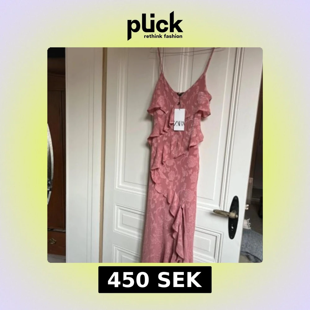 Säljer en romantisk rosa långklänning från ZARA med tunna axelband och vackra volangdetaljer framtill. Klänningen har ett subtilt blommönster och är tillverkad i ett lätt, flowy material som ger en feminin siluett.