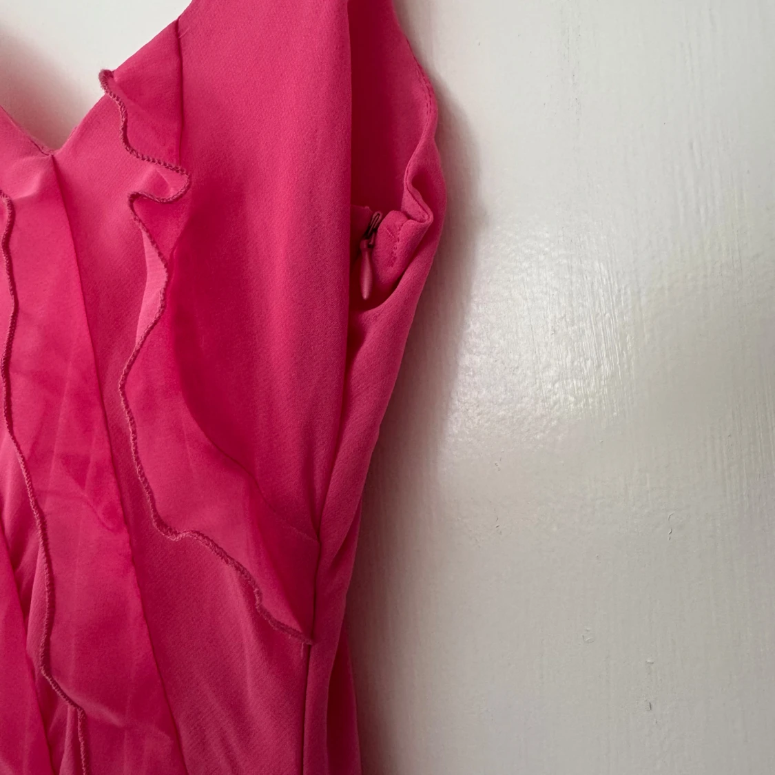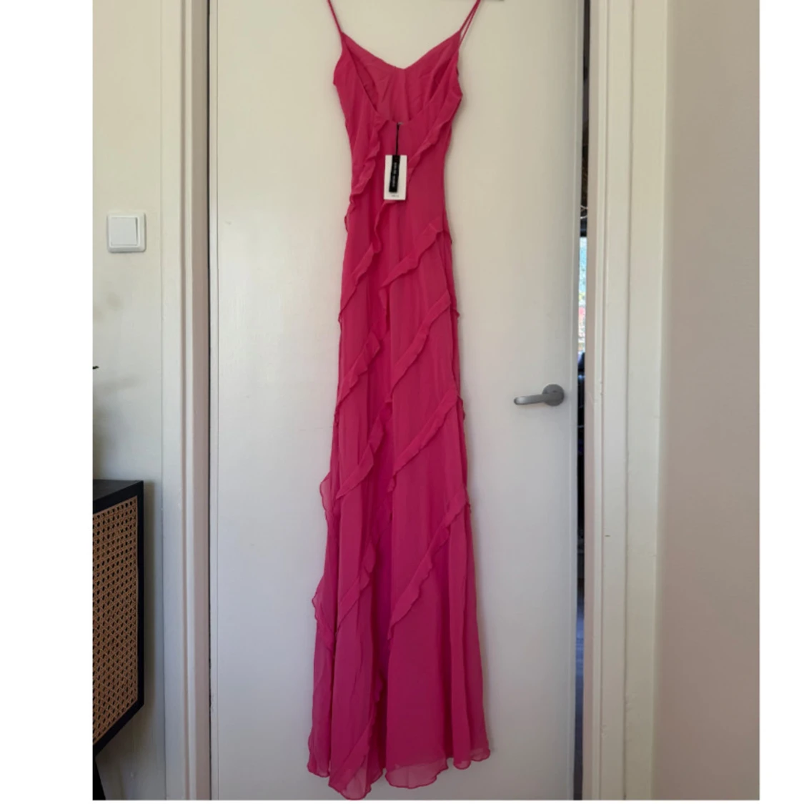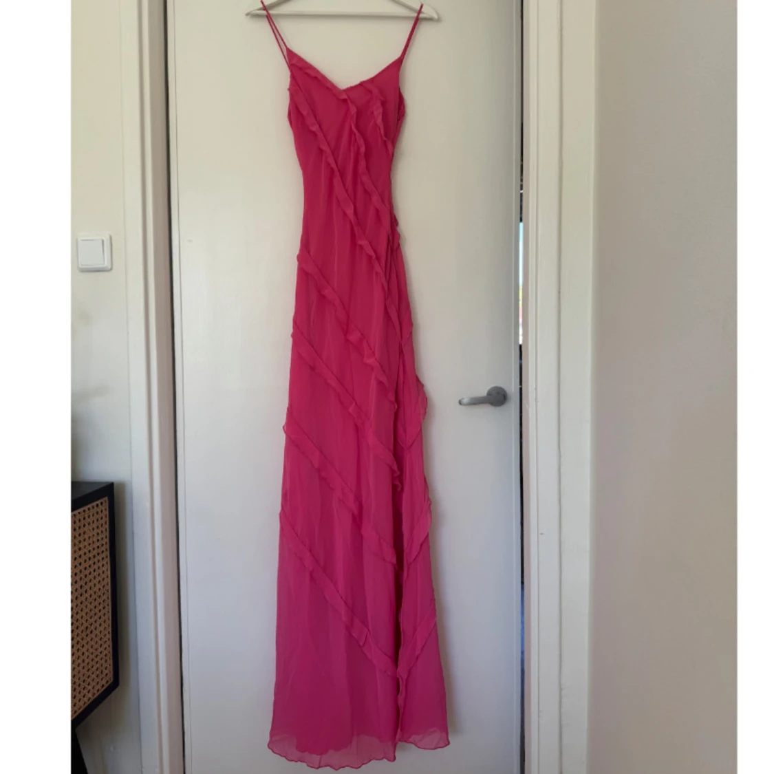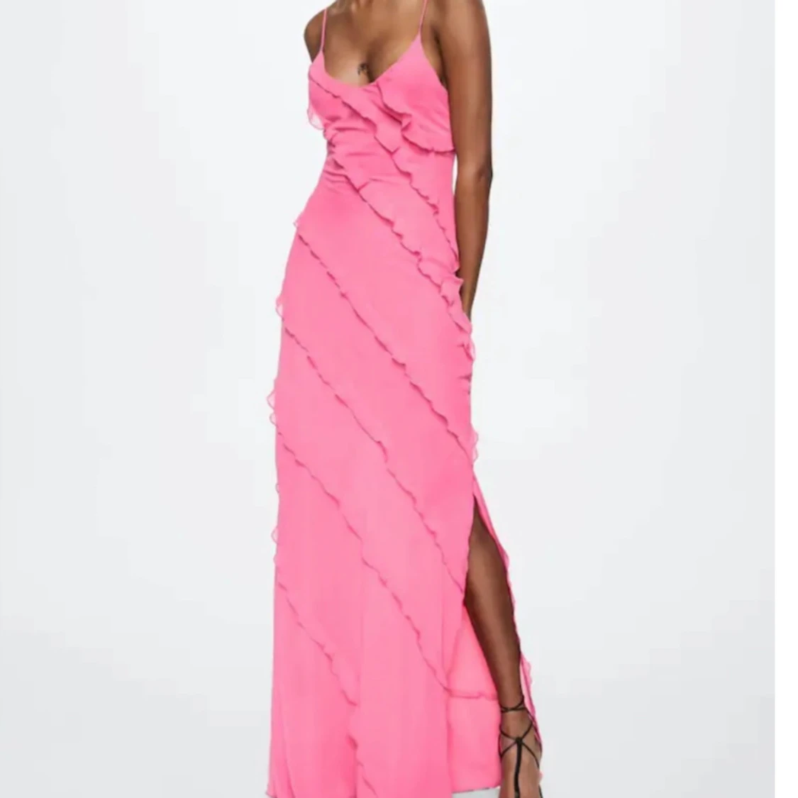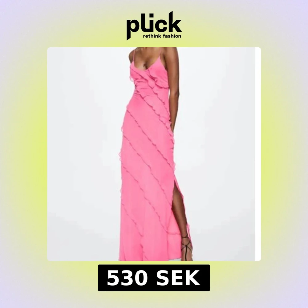 Säljer en superfin rosa långklänning från mango limited edition med tunna axelband och v-ringning. Klänningen har diagonala volangdetaljer och en slits på sidan. Materialet är lätt och flowy polyester, perfekt för sommarens alla tillfällen. Dragkedja i sidan