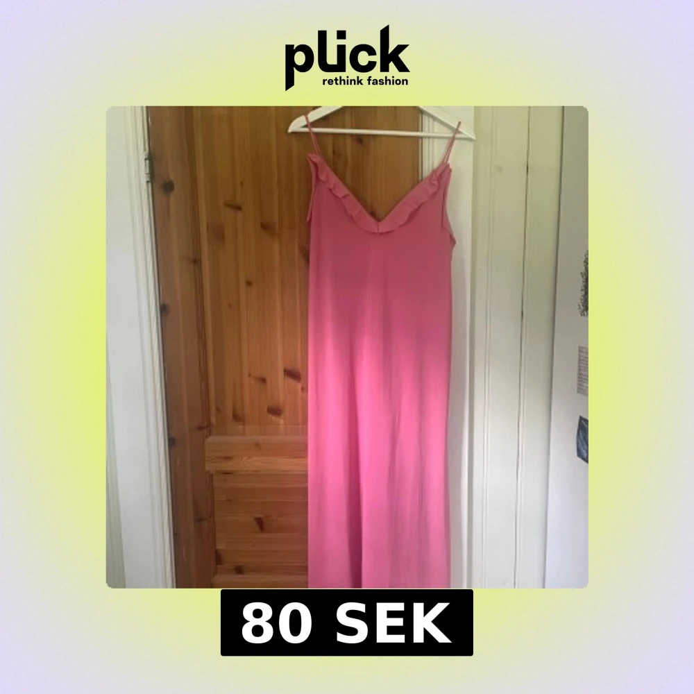 Säljer en lång, ärmlös rosa klänning med smala axelband och v-ringning. Klänningen har en söt volangdetalj längs ringningen och är i ett mjukt, lätt material som faller snyggt. Från Zara