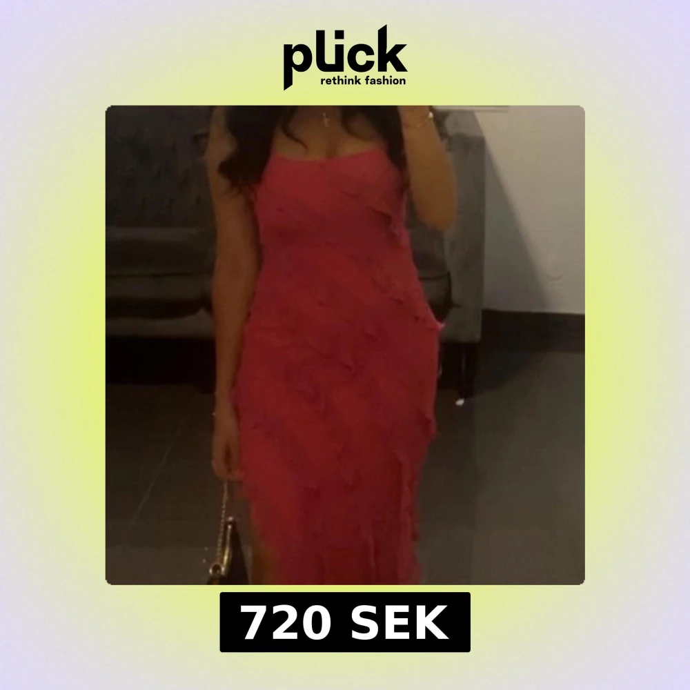 Säljer en snygg rosa långklänning med volangdetaljer över hela klänningen. Klänningen kan bäras på två sätt, som halterncek och som kryss vid bröstet och sen knyt där bak, den har ett slit på sidan. Den har figurnära passform som ger en elegant siluett. Storlek: 6, 34, xs/s. Använd en gång. Från Oh polly.
