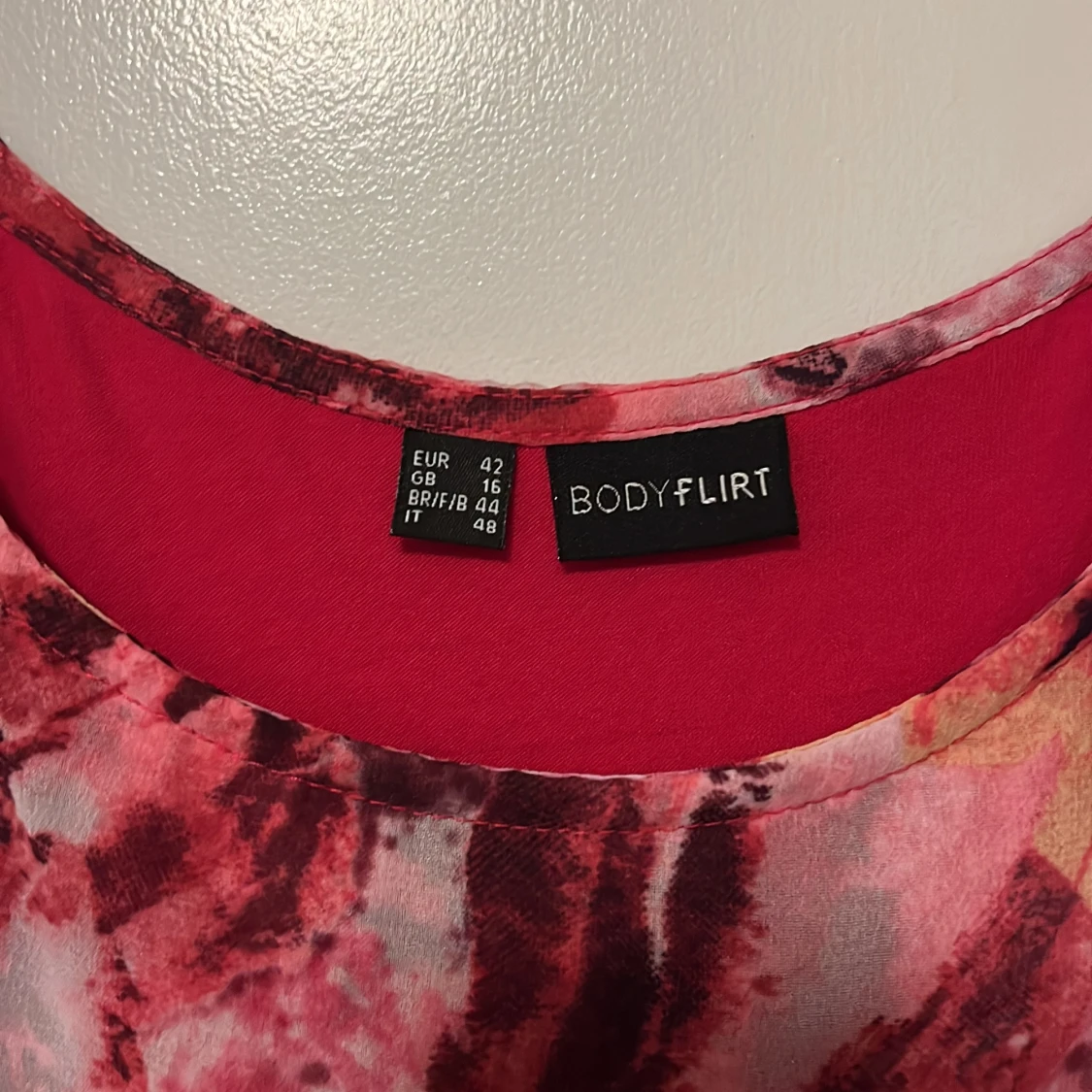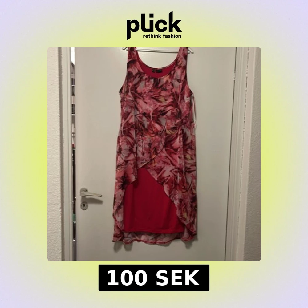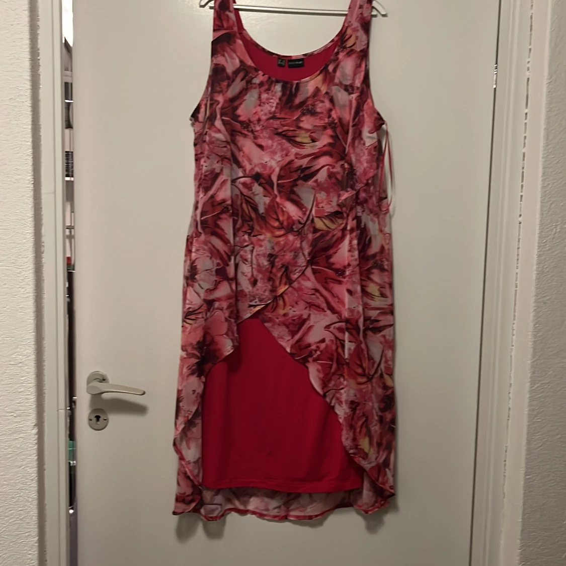 Säljer en snygg rosa klänning från Bodyflirt med ett abstrakt mönster i olika nyanser av rosa och rött. Klänningen är ärmlös och har en asymmetrisk design med ett lager över kjolen. Perfekt för en färgglad look! Har en liten fläck nertill (se bild två).