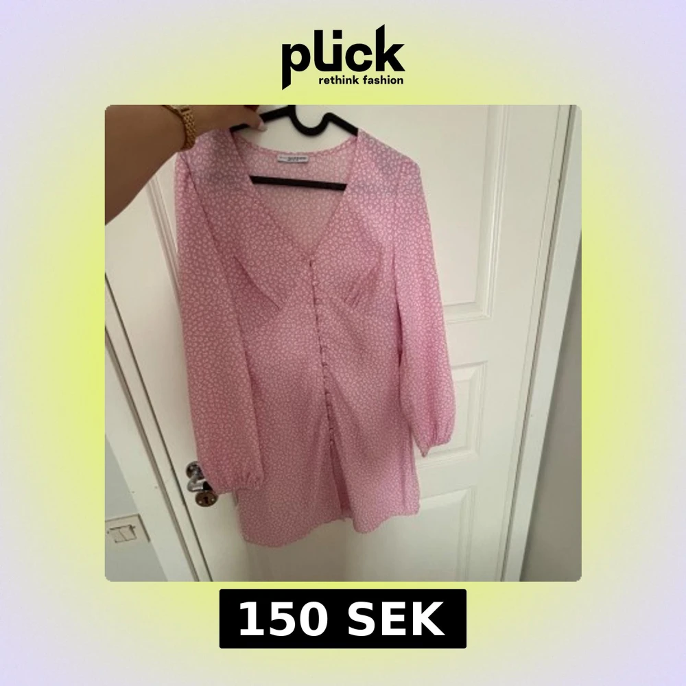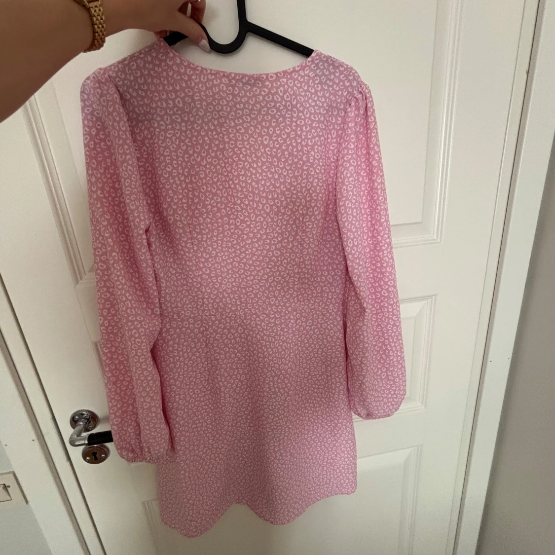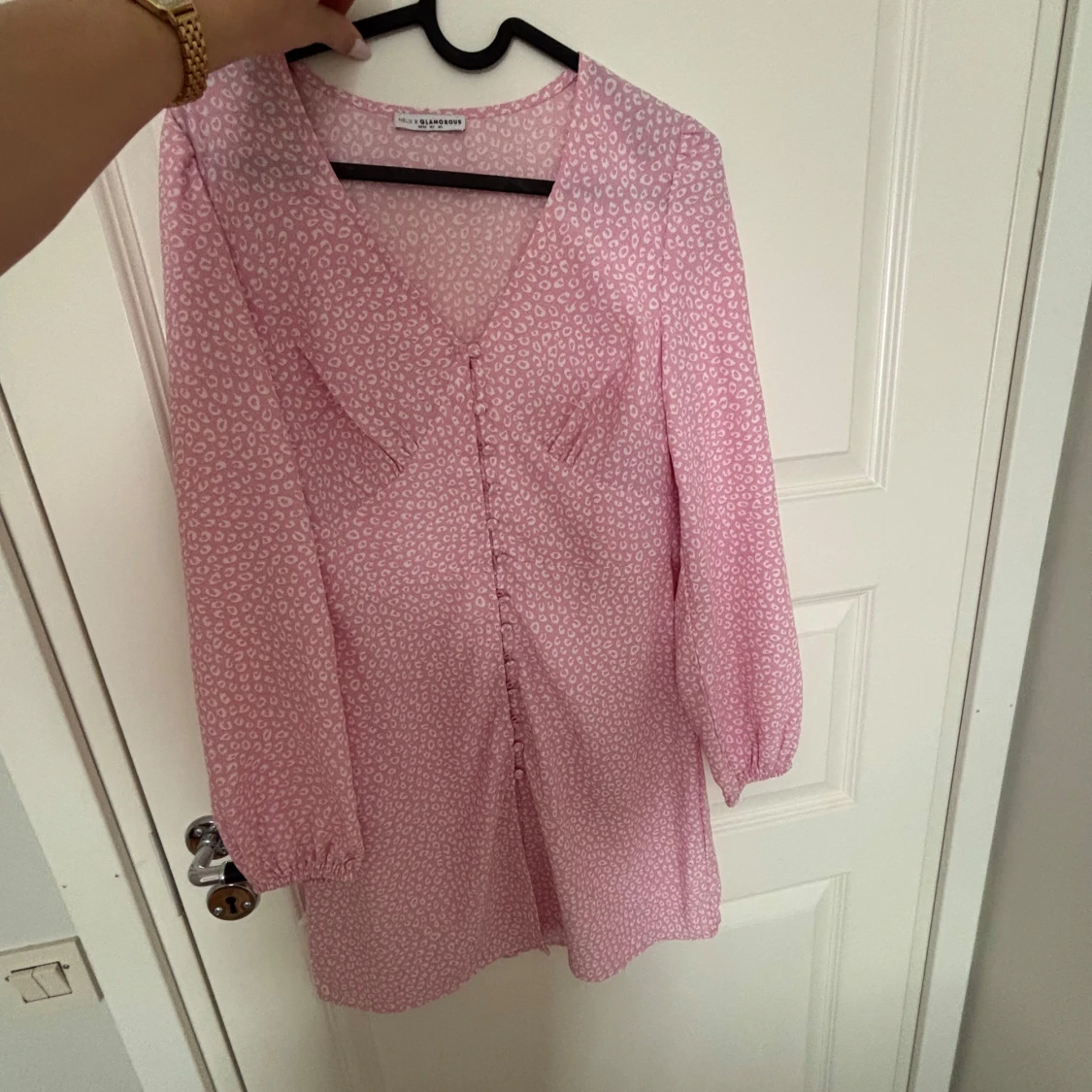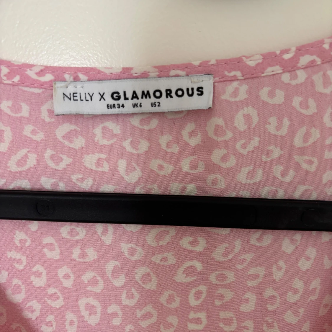 Säljer en söt rosa klänning med ett diskret mönster från Nelly x Glamorous. Klänningen har långa ärmar och knappar framtill, perfekt för en somrig look. Den är i storlek 34 och har en v-ringad design.