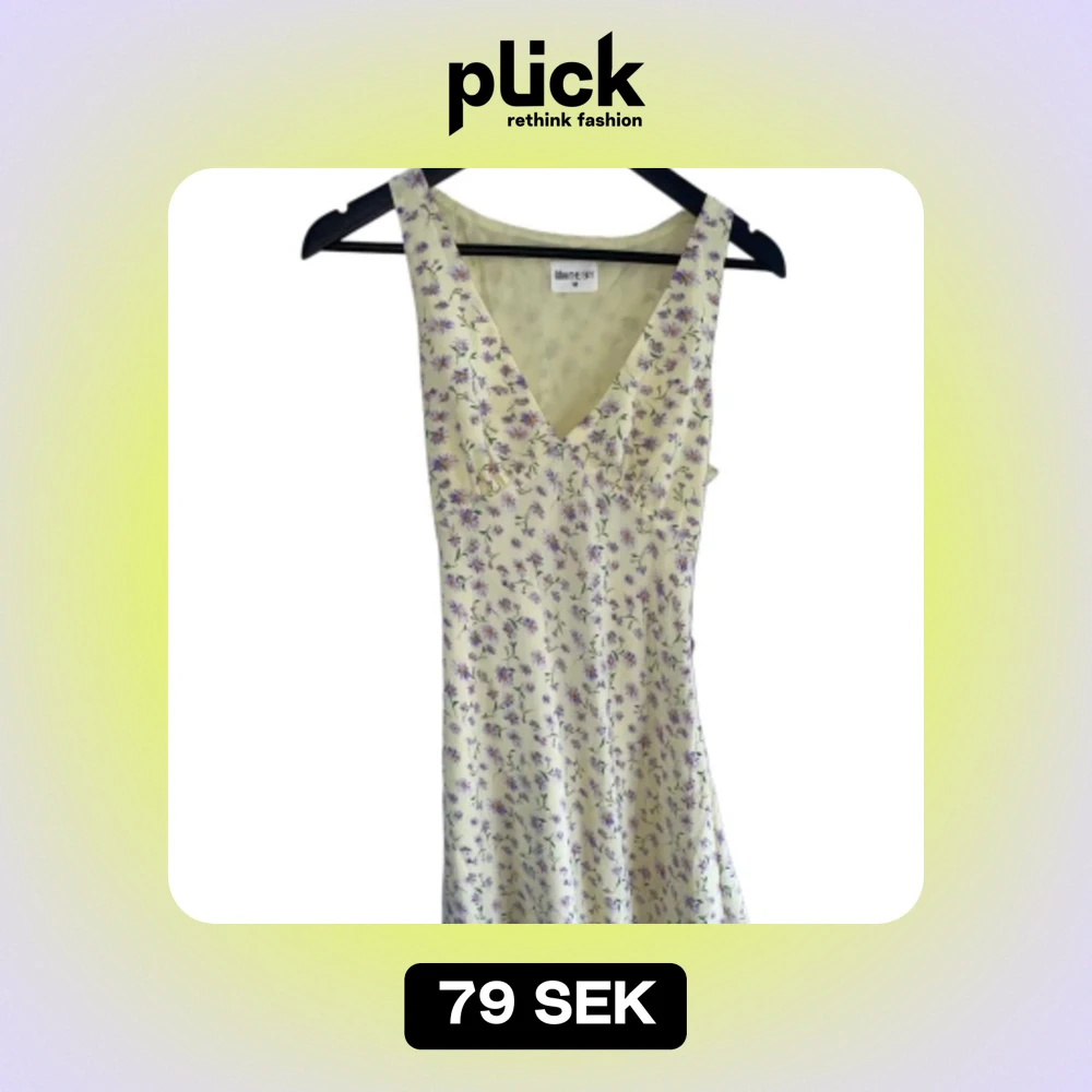 En vacker blommig klänning från Kiss The Sky i storlek M. Klänningen är ljus med ett mönster av små lila blommor. Den har en v-ringad hals och är ärmlös, vilket gör den perfekt för varmare väder.