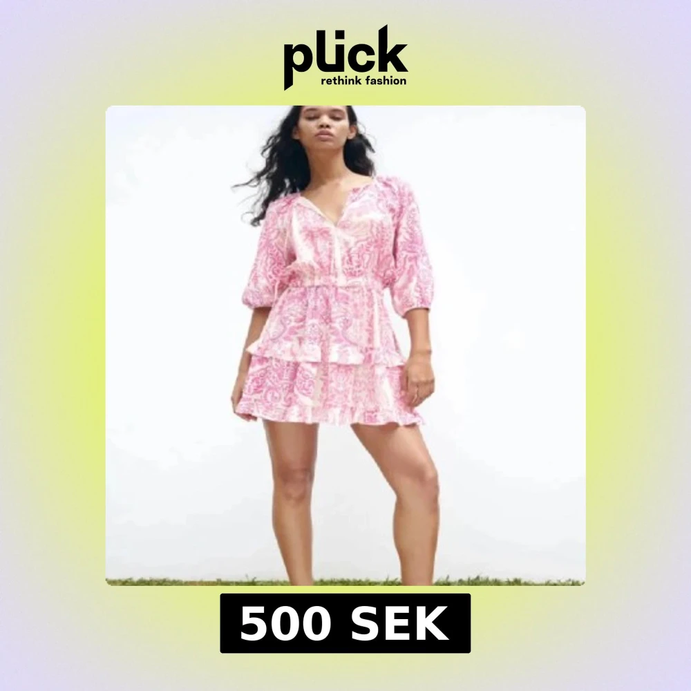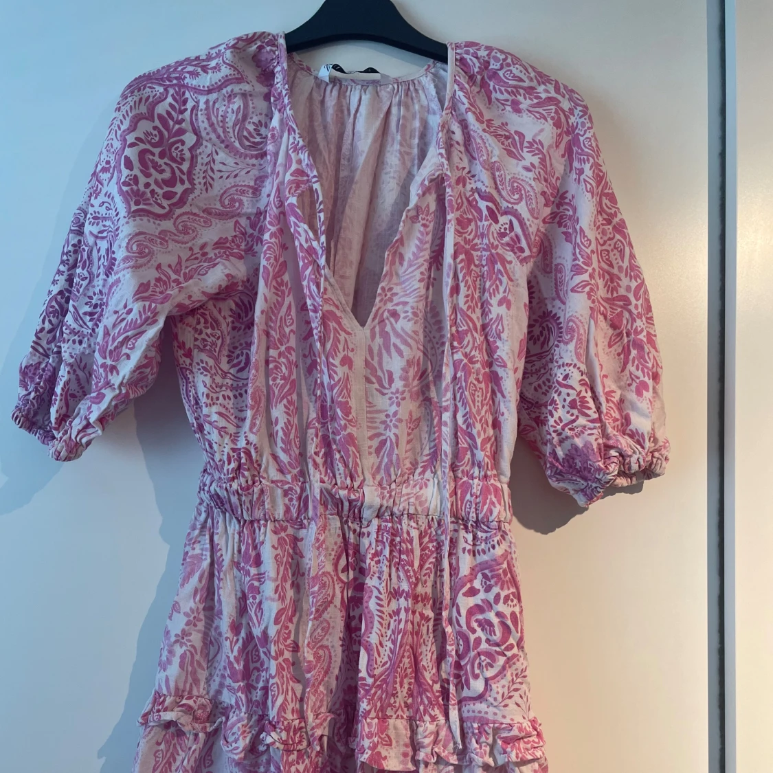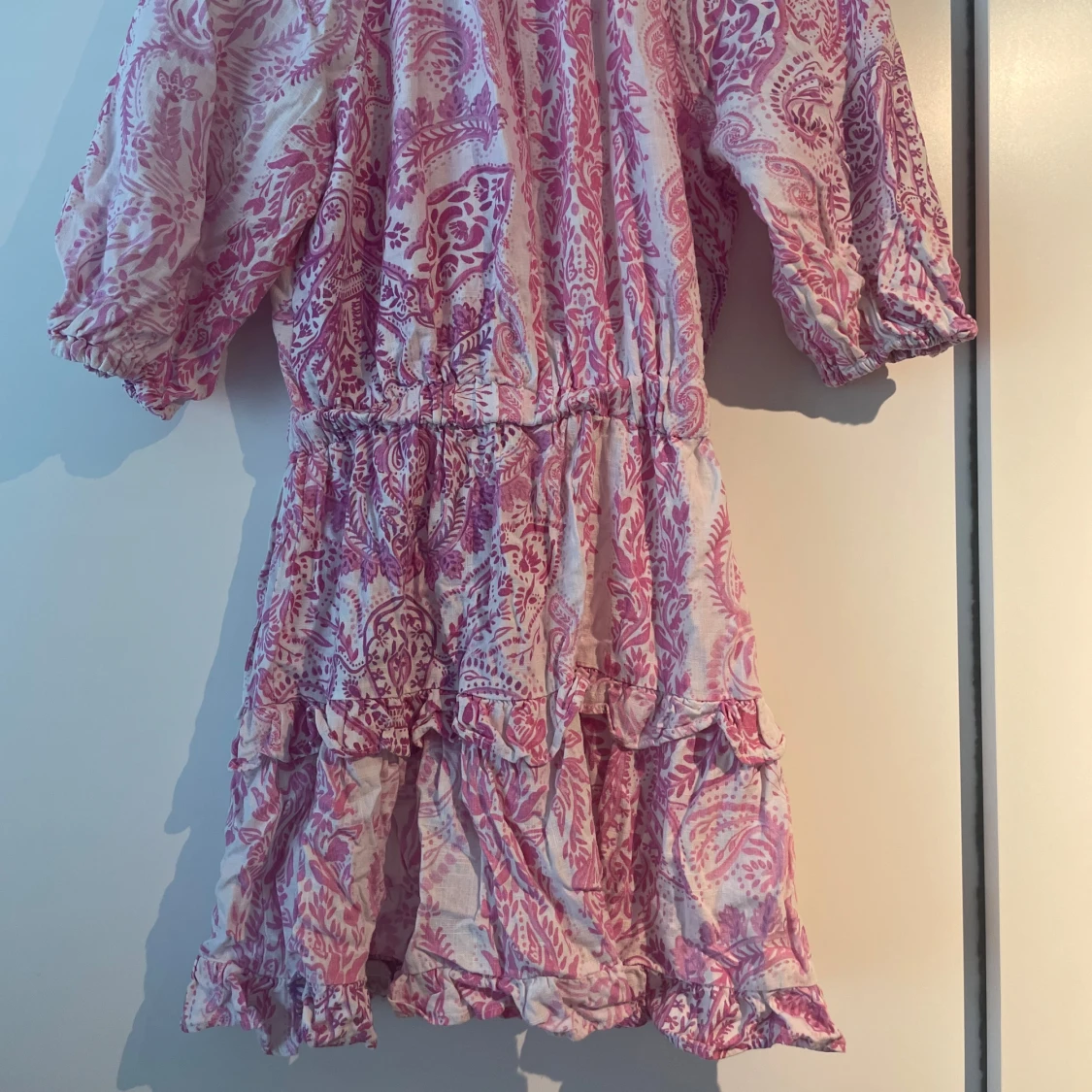 Superfin kortklänning i rosa och vitt med volanger och trekvartsärmar. Klänningen har ett snyggt mönster, v-ringning och resår i midjan för en skön passform. Perfekt för sommarens alla tillfällen! Endast använd ca 2 gånger!!