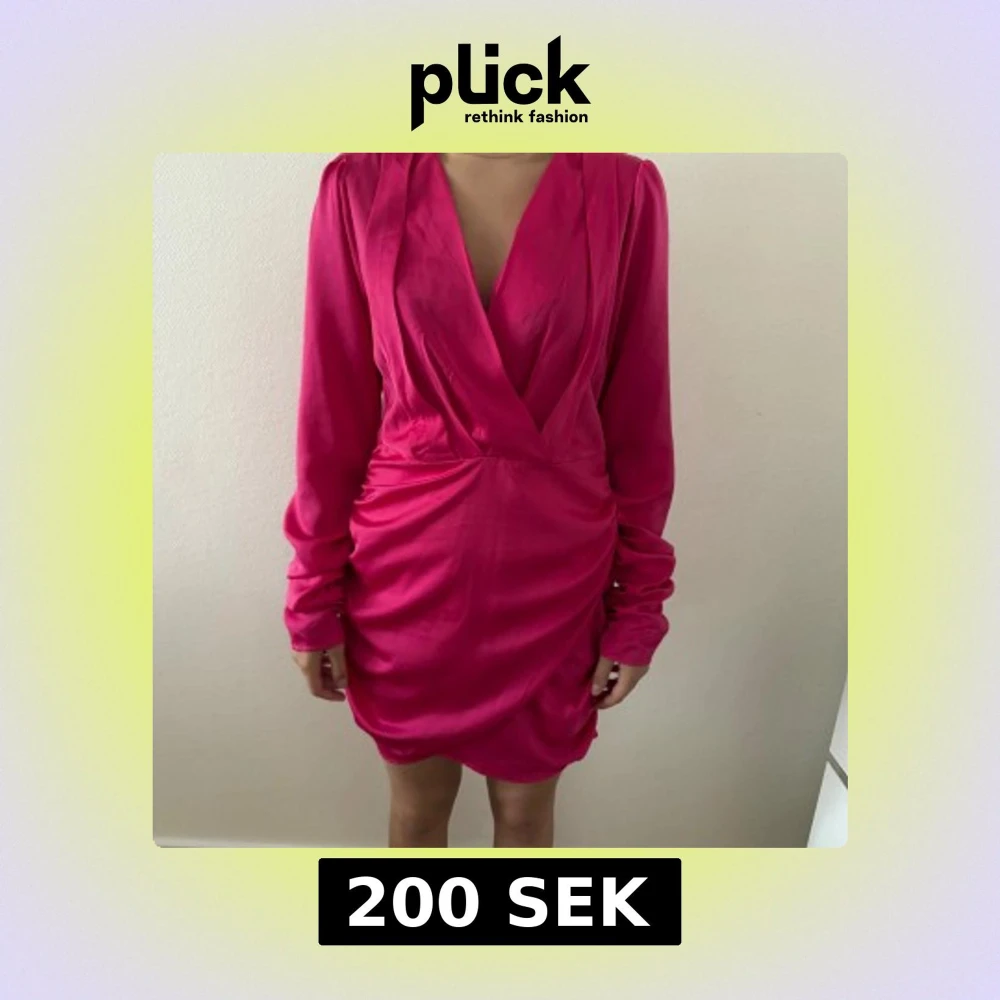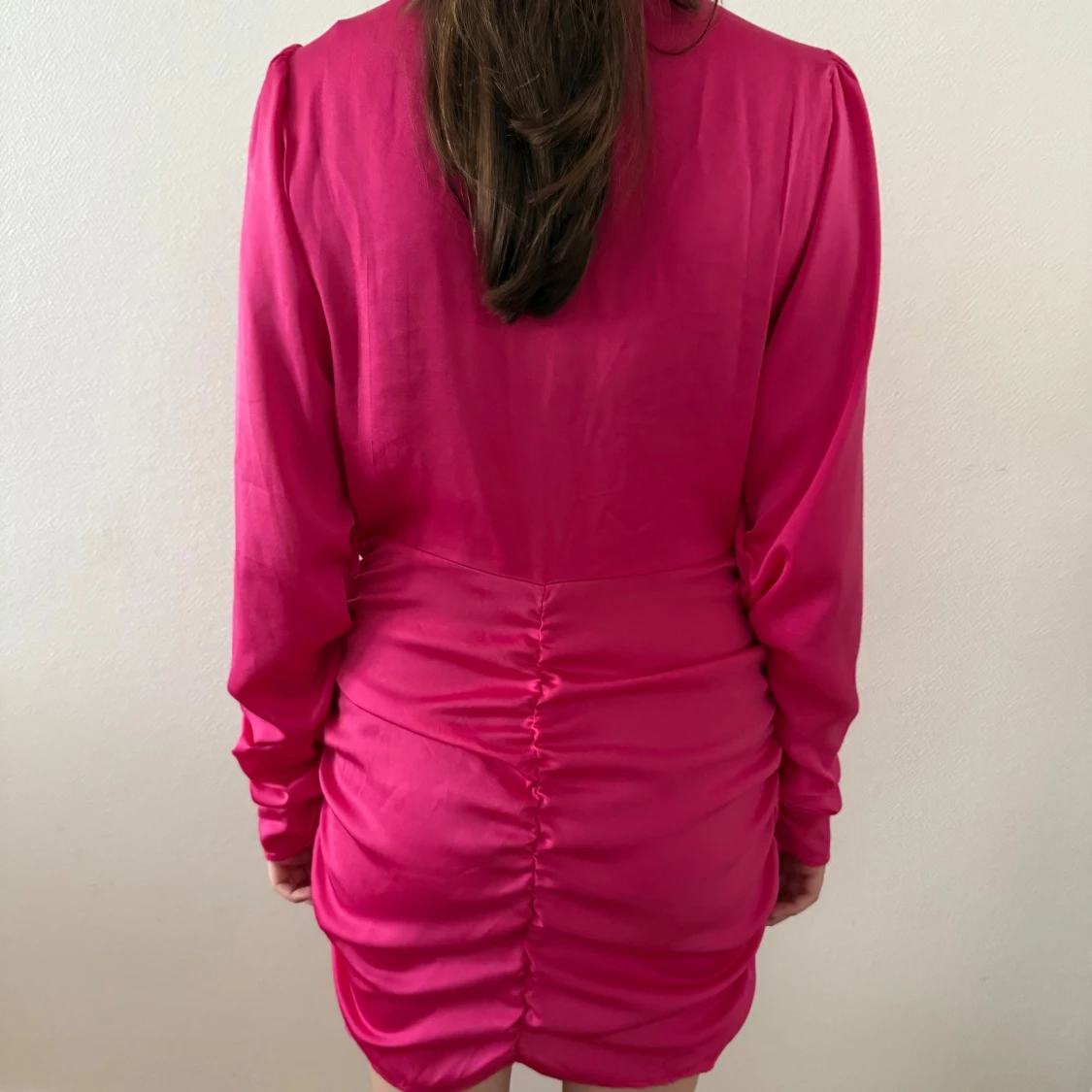 Snygg kort rosa klänning med omlott och djup v-ringning. Klänningen har långa ärmar och draperad effekt både fram och bak, vilket ger en cool och trendig look. Perfekt för dig som vill sticka ut med en färgstark outfit.