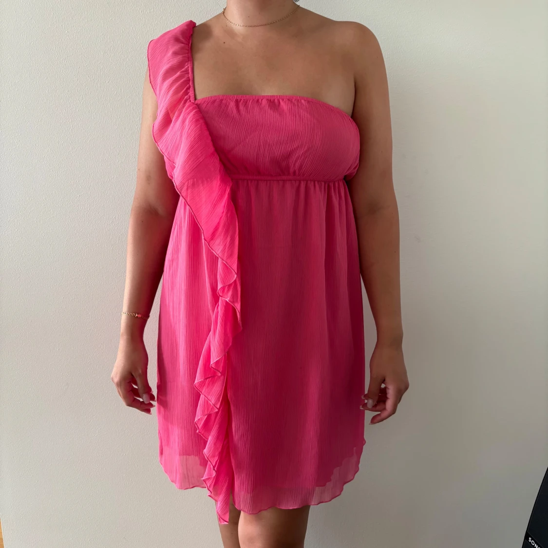 Säljer en söt rosa kortklänning med oneshoulder och en stor volang längs axeln och ner över framsidan. Klänningen har en luftig passform och är tillverkad i ett lätt, skrynkligt tyg som ger en cool vibe. Perfekt för dig som gillar färg och vill sticka ut.