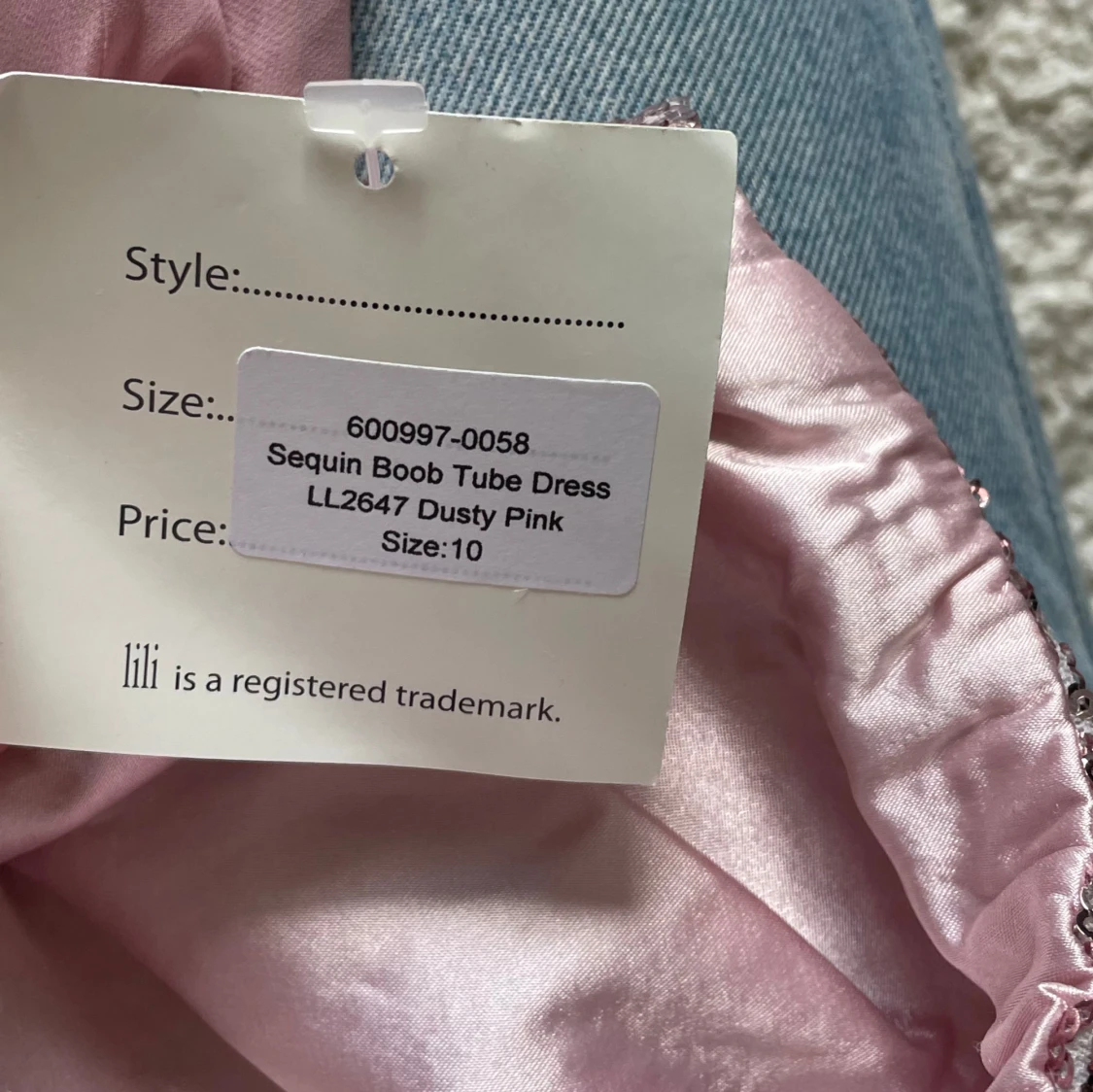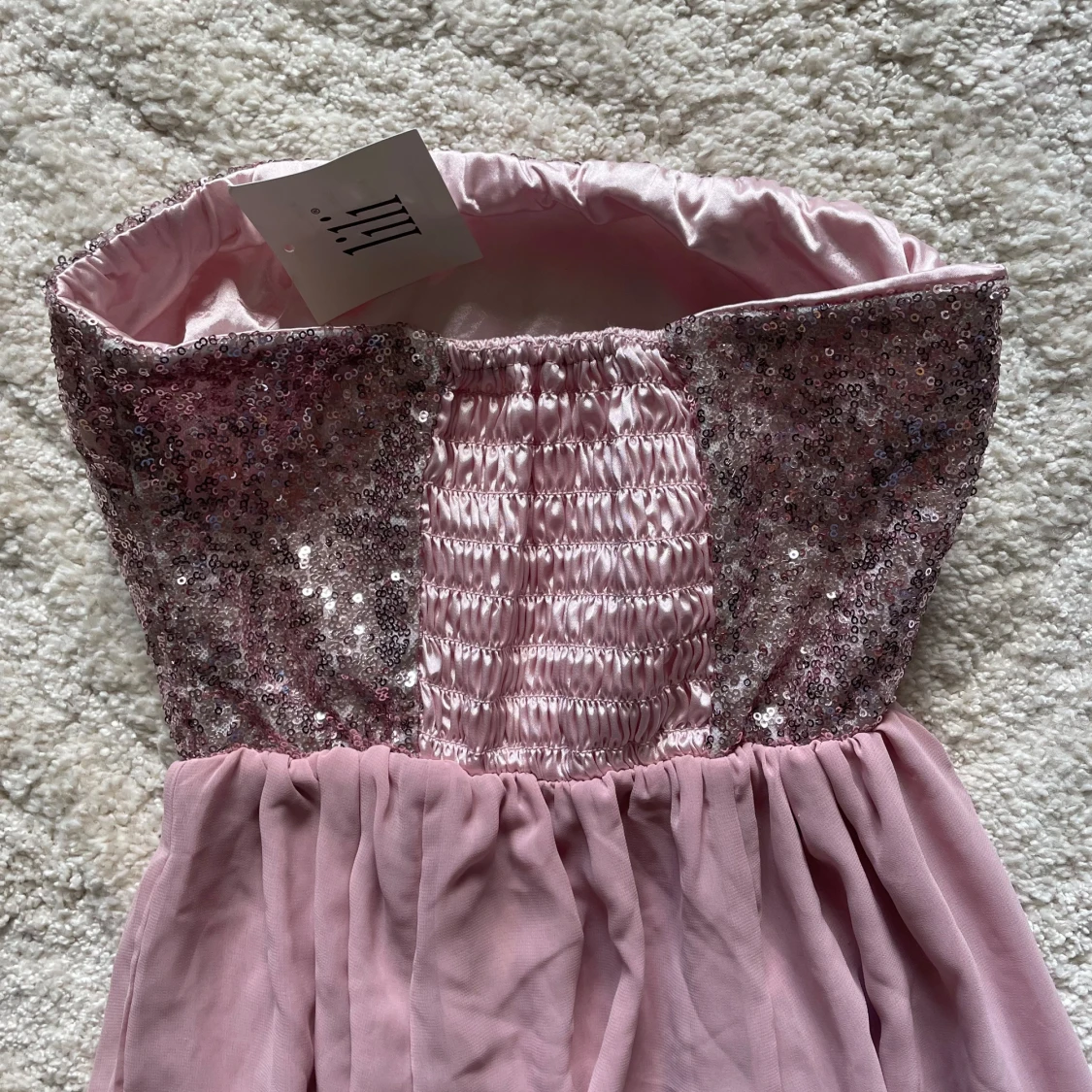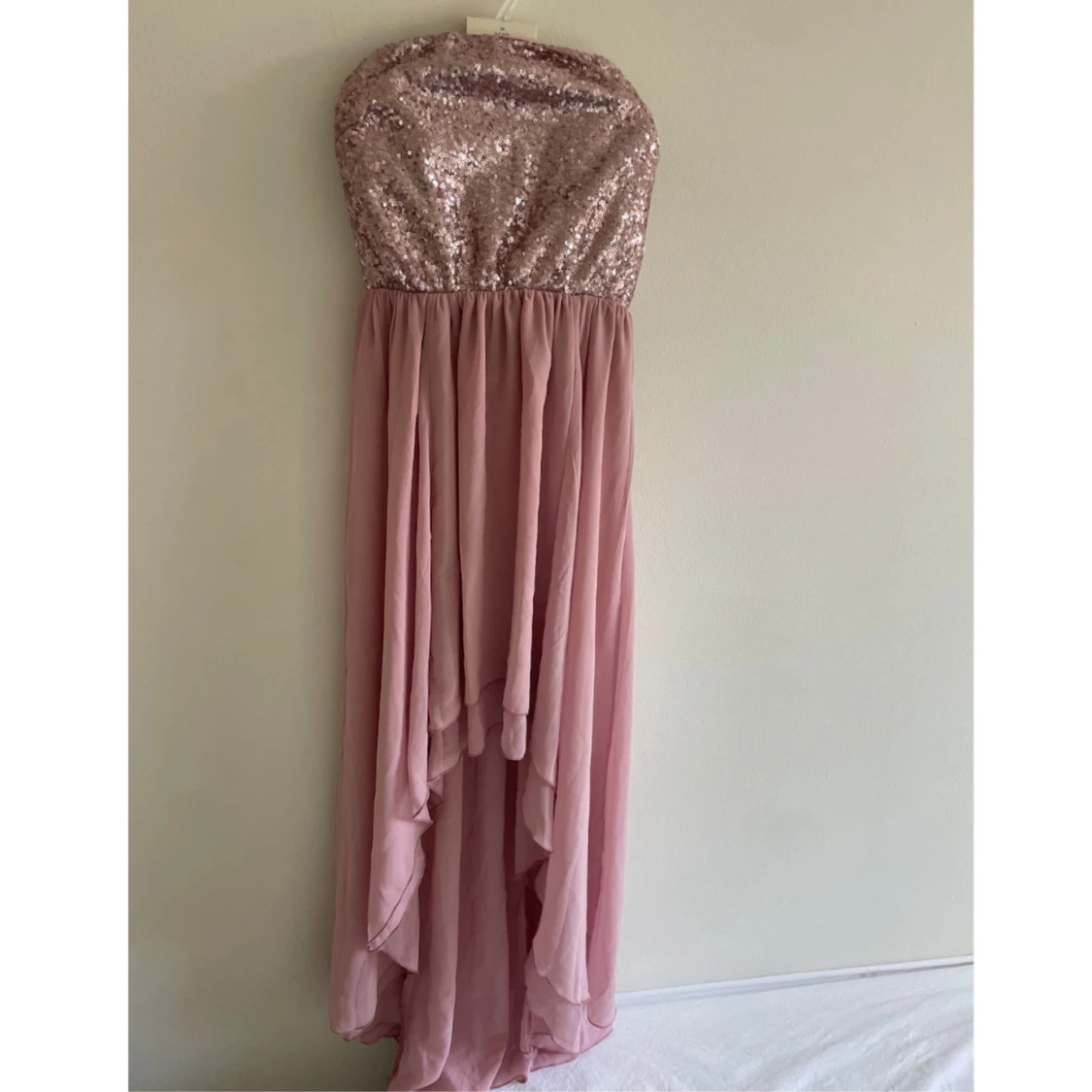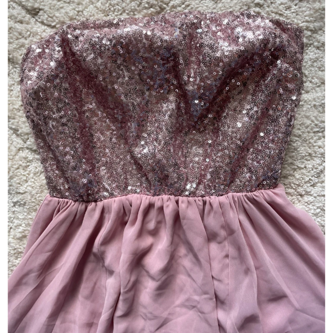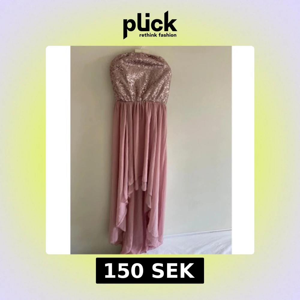 Säljer en superfin långklänning i dusty pink från Lili. Överdelen är axelbandslös och täckt med glittriga paljetter, medan kjolen är i mjukt, flygigt tyg med snyggt fall. Perfekt för dig som vill sticka ut med en glamorös look! Oanvänd med lapp kvar. Passar bra på bröllop eller när man vill känna sig extra fin. UK 10, motsvarar 38 eller M i storlek.