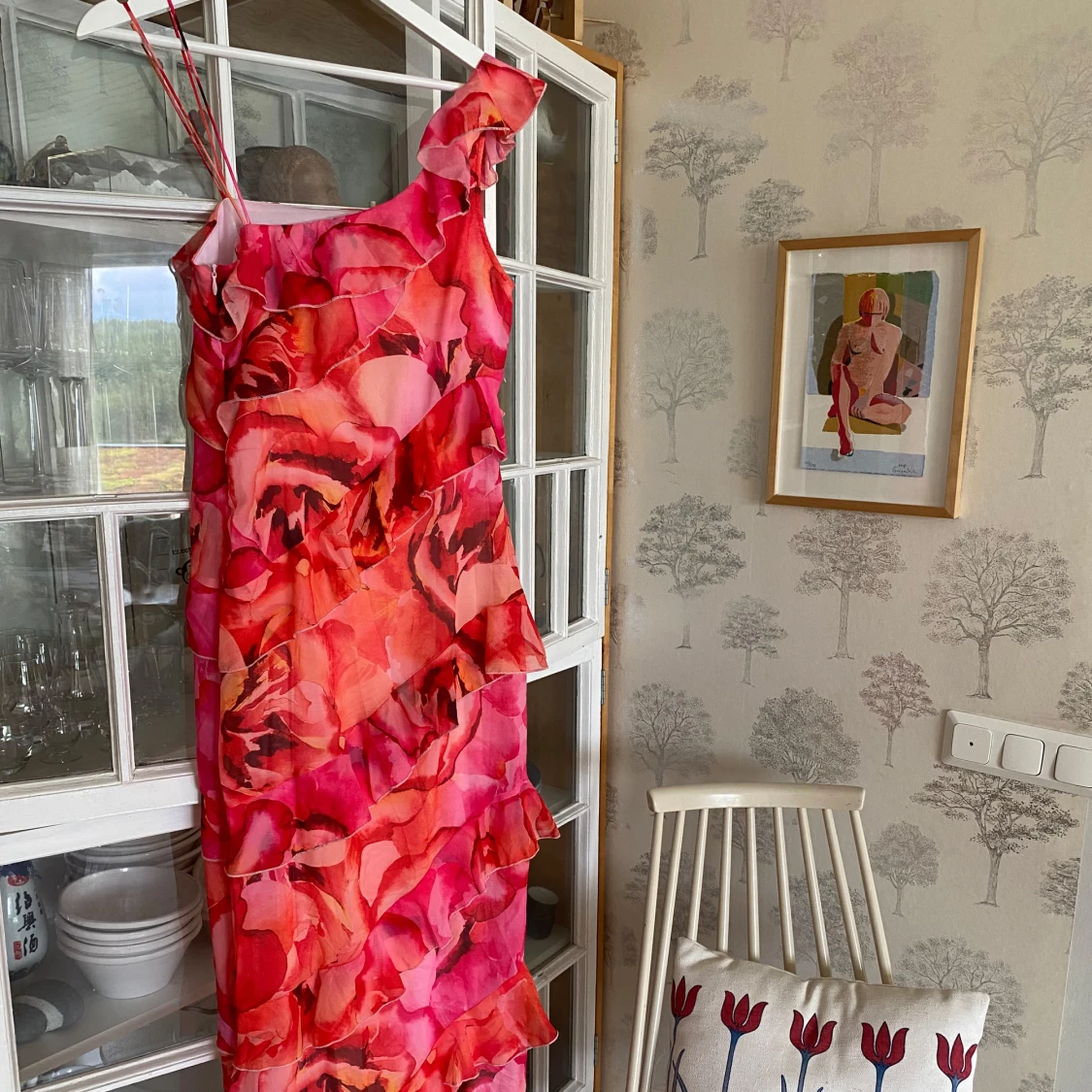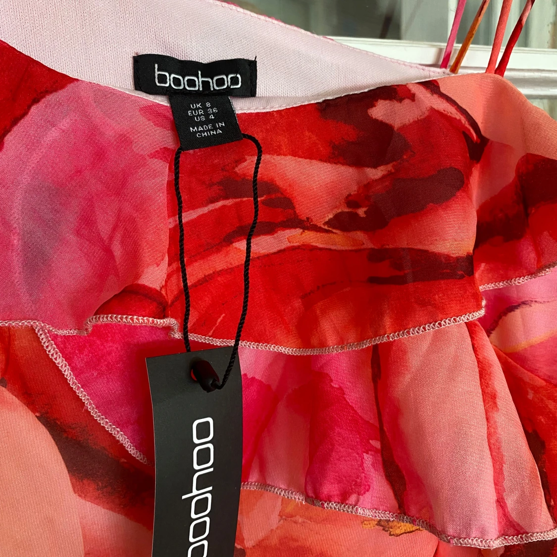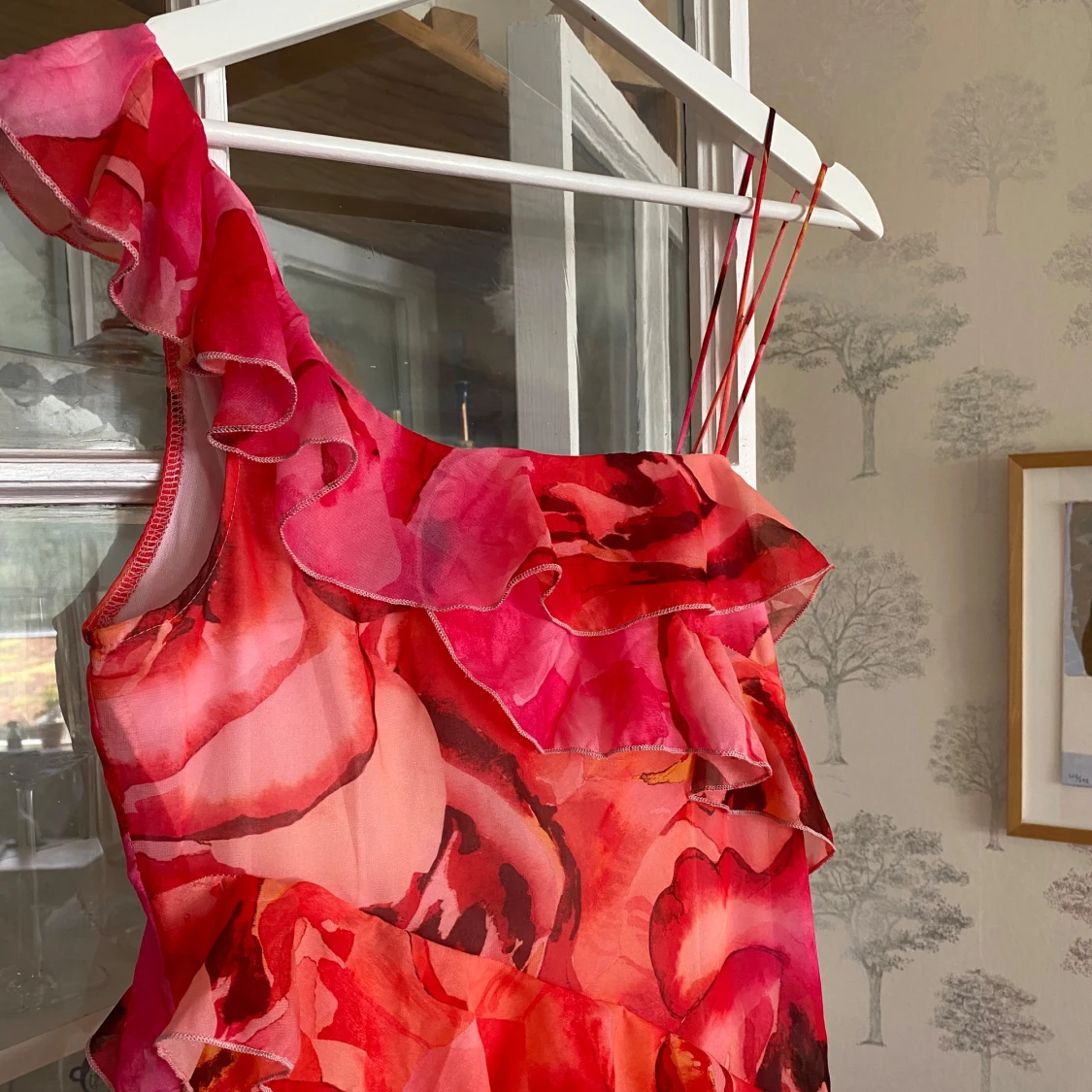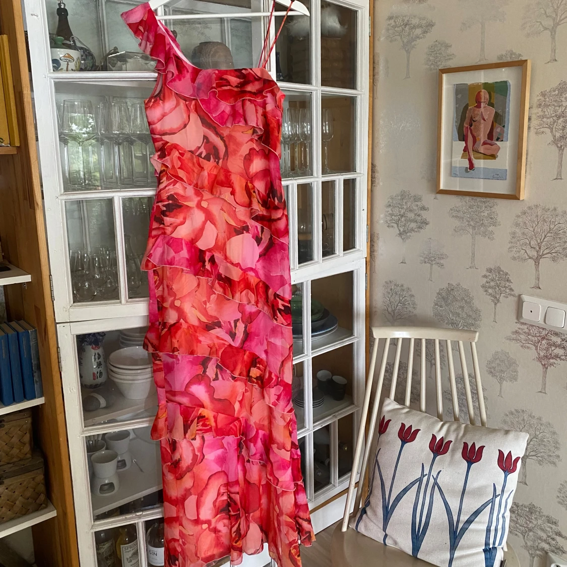 Magisk slutsåld långklänning från Boohoo med blommigt mönster i rosa och rött. Perfekt till midsommar!! Klänningen har volanger och asymmetrisk axel med smala axelband. Har ingen bild på mig då den är lite tight för mig som vanligtvis är en st 38. Den följer ens kurvor!