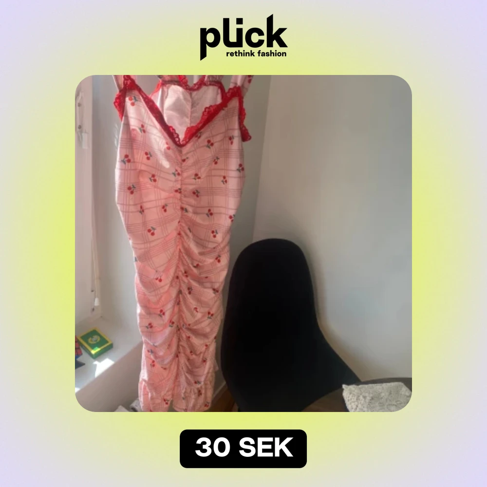 Säljer en superfin rosa långklänning med rutigt mönster och små söta körsbär. Klänningen har röda spetsdetaljer vid bysten och axelbanden. Perfekt för sommarens fester eller en mysig picknick i parken! 🍒