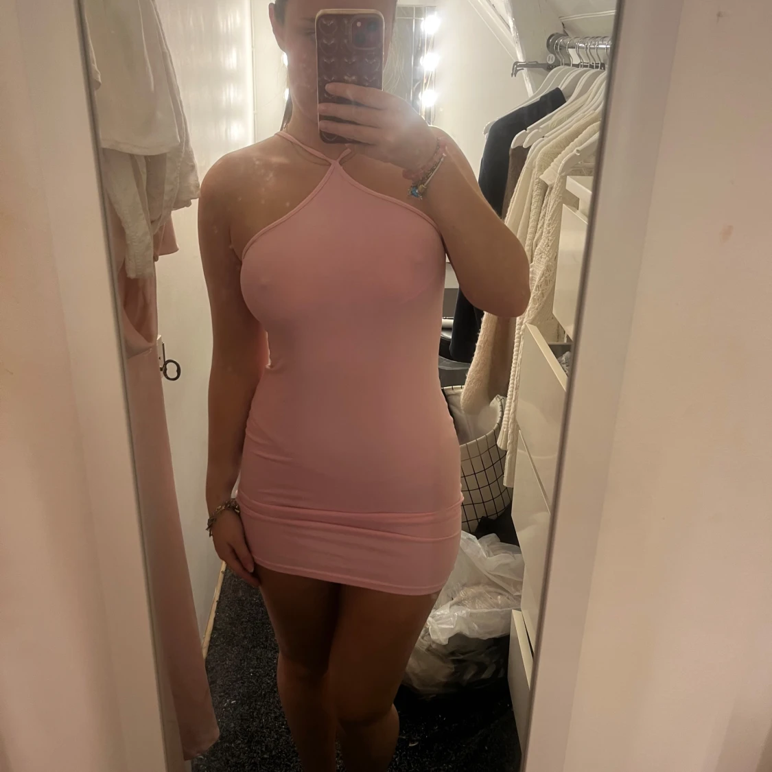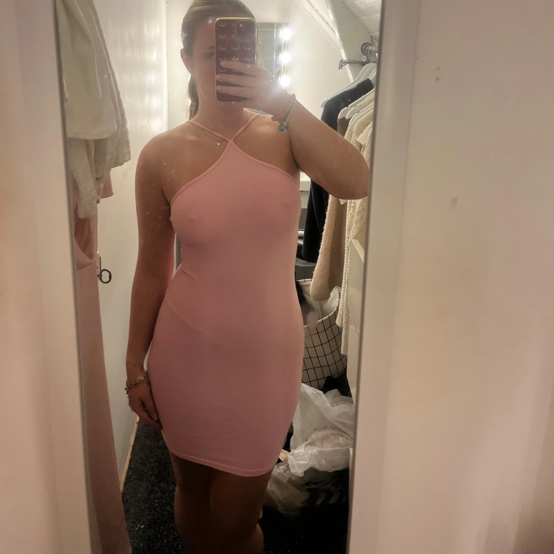 Säljer en ljusrosa, tight och kort klänning med halterneck och smala axelband som korsas framtill. Klänningen är ärmlös och har en enkel, stilren design som sitter figurnära.🩷🩷