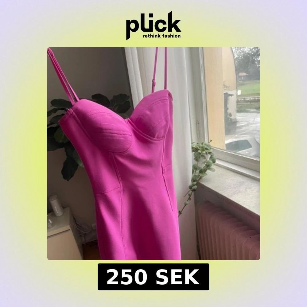 Festlig rosa klänning med smala axelband och markerad byst. Tight passform som framhäver figuren, slits bak och dragkedja i ryggen. Materialet känns stretchigt och följsamt.
