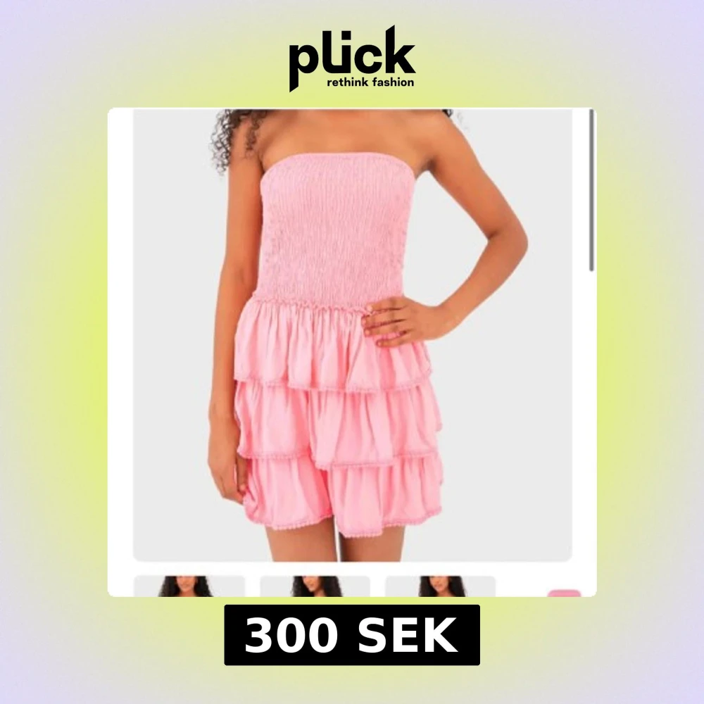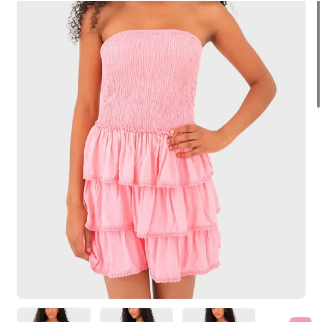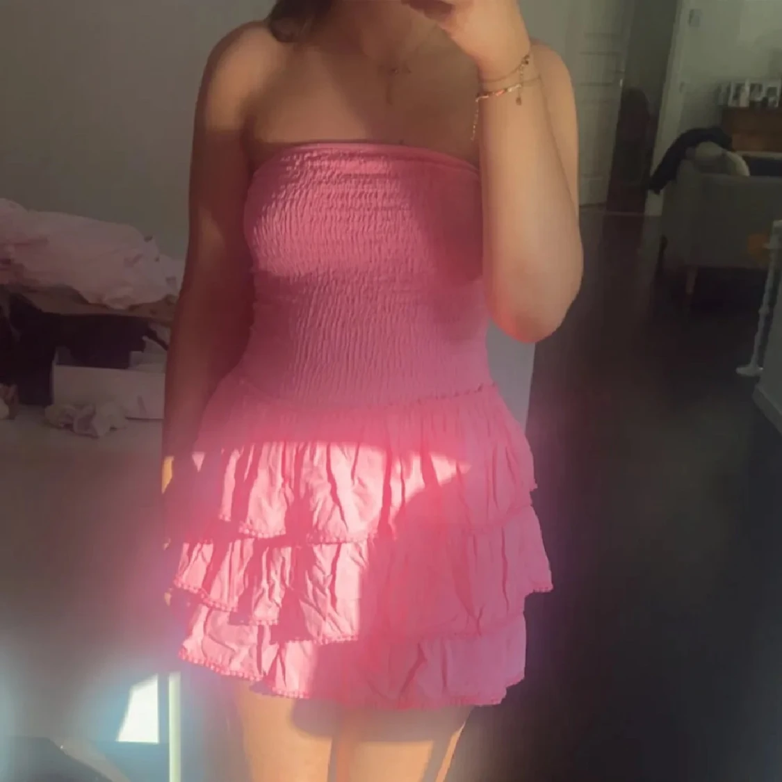 Supersöt rosa kortklänning med smock upptill och flera lager volanger nedtill. Axelbandslös design som ger en fräsch och ungdomlig vibe. Perfekt för varma dagar och sommarhäng. Materialet känns lätt och luftigt mot huden.