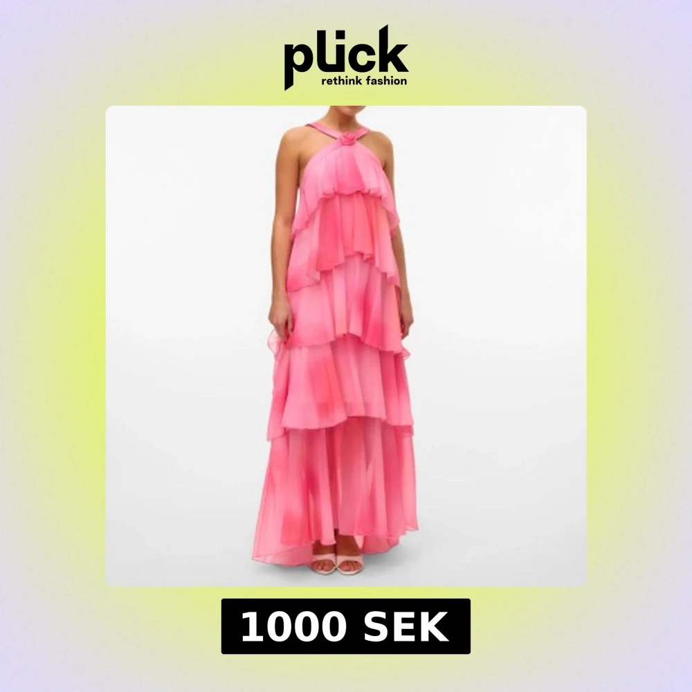 Superfin långklänning i flera lager rosa volanger, med halterneck och en söt rosett-detalj framtill. Klänningen har öppen rygg och är tillverkad i ett lätt, flowy material som ger en drömmig känsla. Perfekt för bal eller sommarfest🥰skriv privat för egna bilder. Köpt för 1200kr