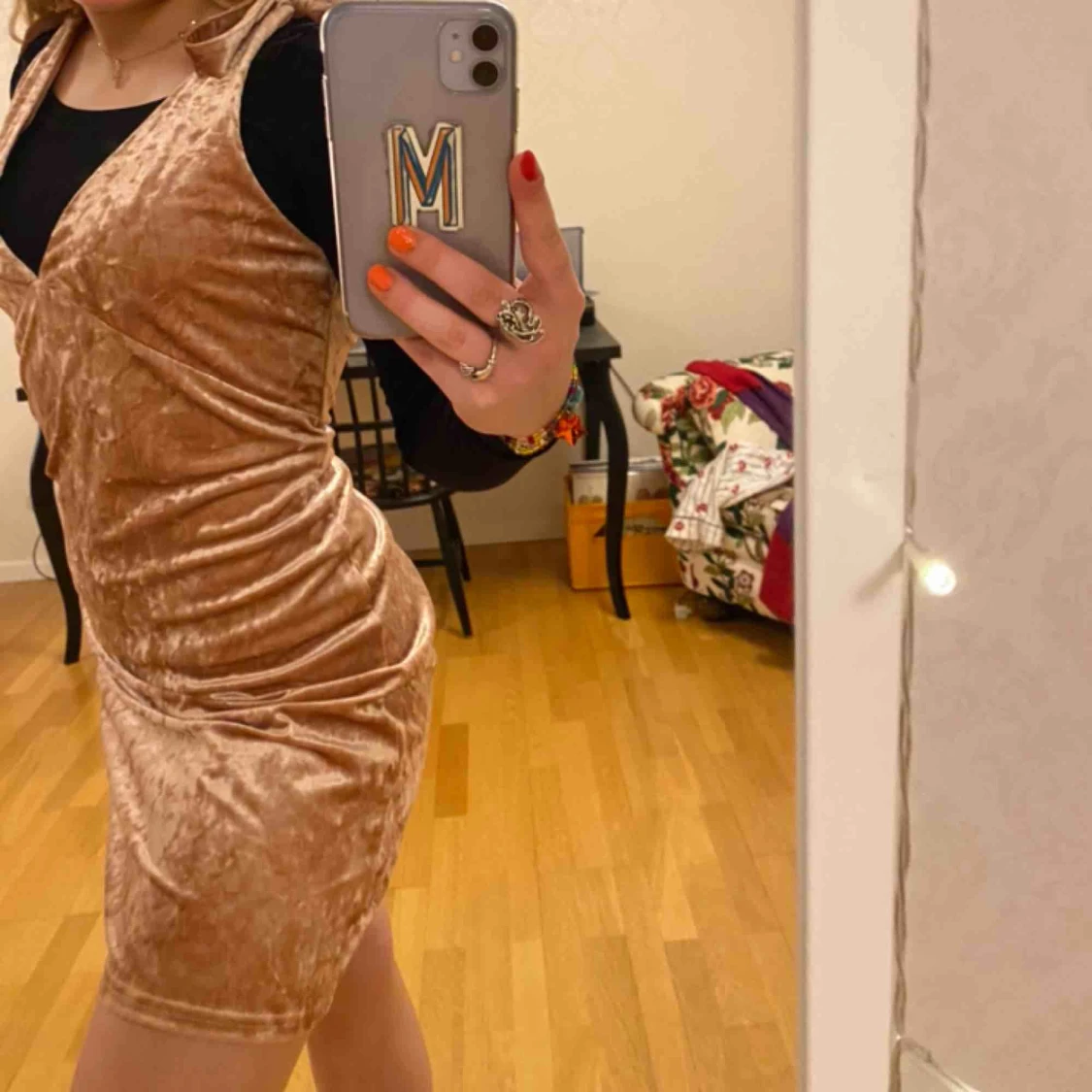Ljusrosa klänning från H&M i sammet!! Jättefina knytdetaljer vid axlarna och bra längd! Kan användas både med och utan tröja under:))