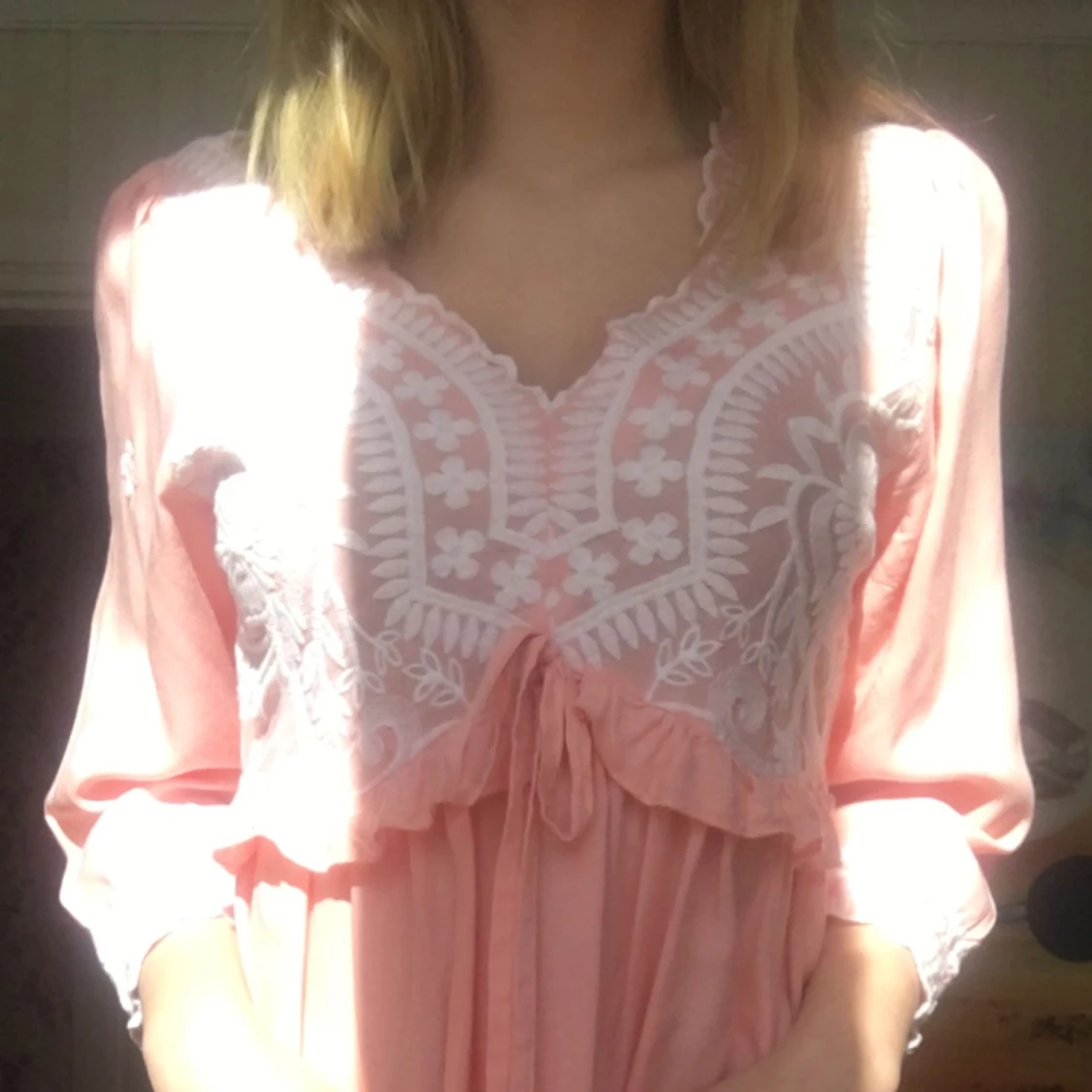 Superfin sommarklänning med broderade detaljer. Är 160cm och den går till knäna på mig. Nypris 700kr. Frakt ingår i priset! Använd 1 gång och den är i perfekt skick!
