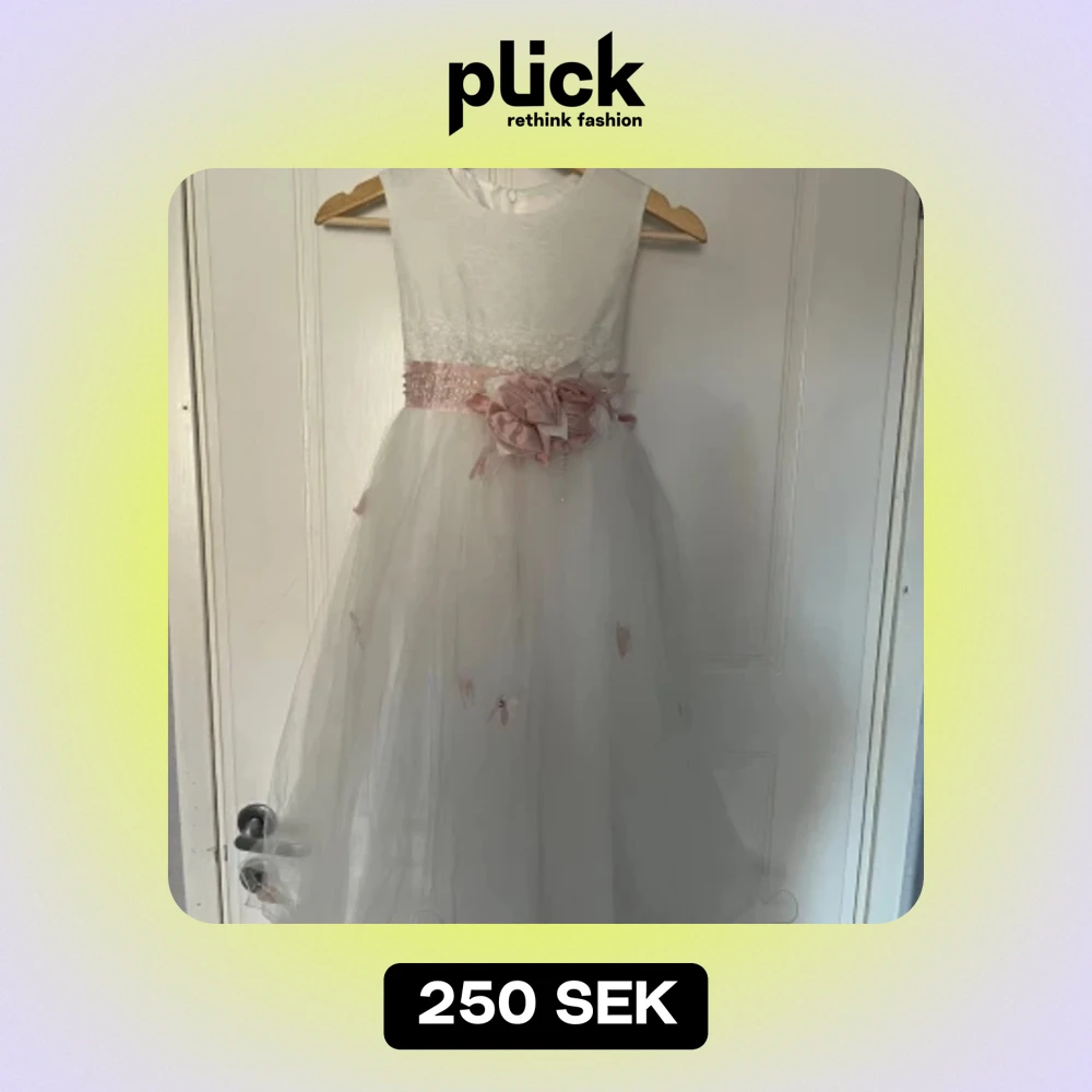 Bra skick, vit klänning med rosa fjärilar, rosetter, pärlor, diamanter. Storlek 8 till 11 år.