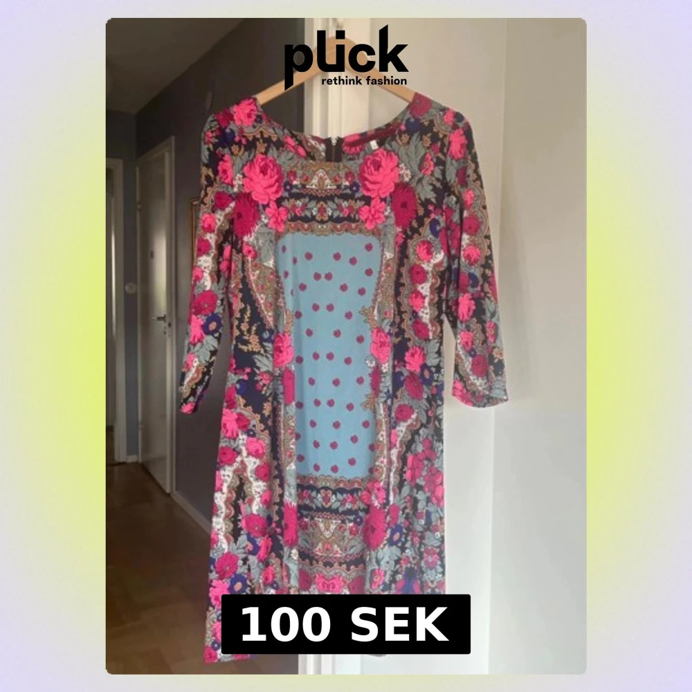 Blommig klänning i starka färger från RoseBud. Trekvartsärm, dragkedja bak. I mycket bra skick storlek S