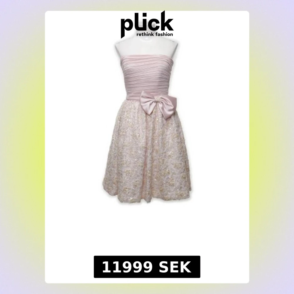 Söt axelbandslös kort klänning i ljusrosa med veckad överdel och stor rosett i midjan. Kjolen är dekorerad med glittriga detaljer (handgjorda paljetter och pärlor satta på ett mönster efter spets) och har en lätt volangig känsla. Perfekt för speciella tillfällen. Köpt för 18 000 på tidigt 90 tal