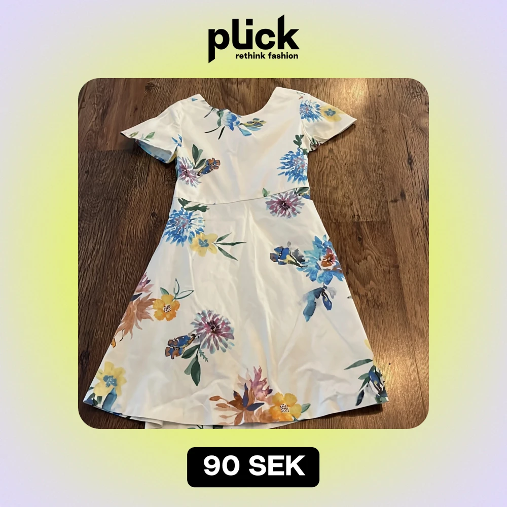 Superfin blommig klänning i vitt med färgglada blommor i blått, gult och rosa. Den har korta ärmar och en söt rosett i ryggen som ger en extra detalj. Perfekt för sommarens fester eller en dag på stan! Obs passar mig som har xs.