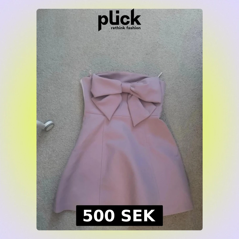 Supersöt ljusrosa axelbandslös klänning med stor rosett i ryggen. Kort modell med figurnära passform upptill och lätt utställd kjol. Perfekt för sommarens alla tillfällen. Materialet känns slätt och stadigt. använt en gång. men behövt sy om dragkedjan därav en vit, men den syns ej så mycket!