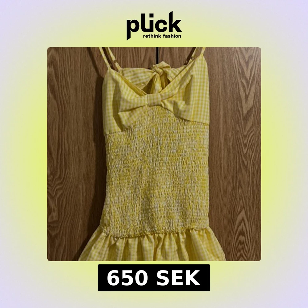 Söt gul klänning med smala axelband, smockad överdel och volangkjol. Klänningen har ett rutigt mönster och en stor rosett framtill samt knytning i ryggen. köpt på plick.