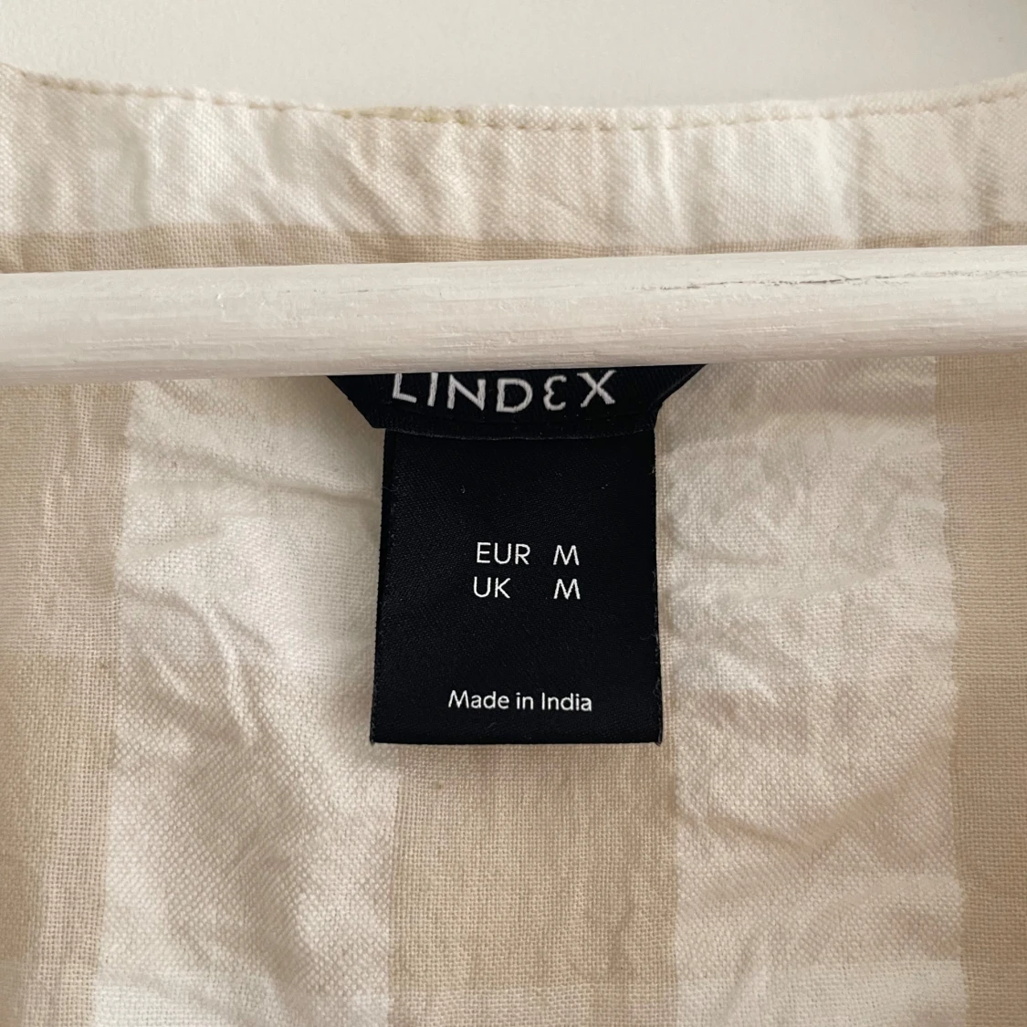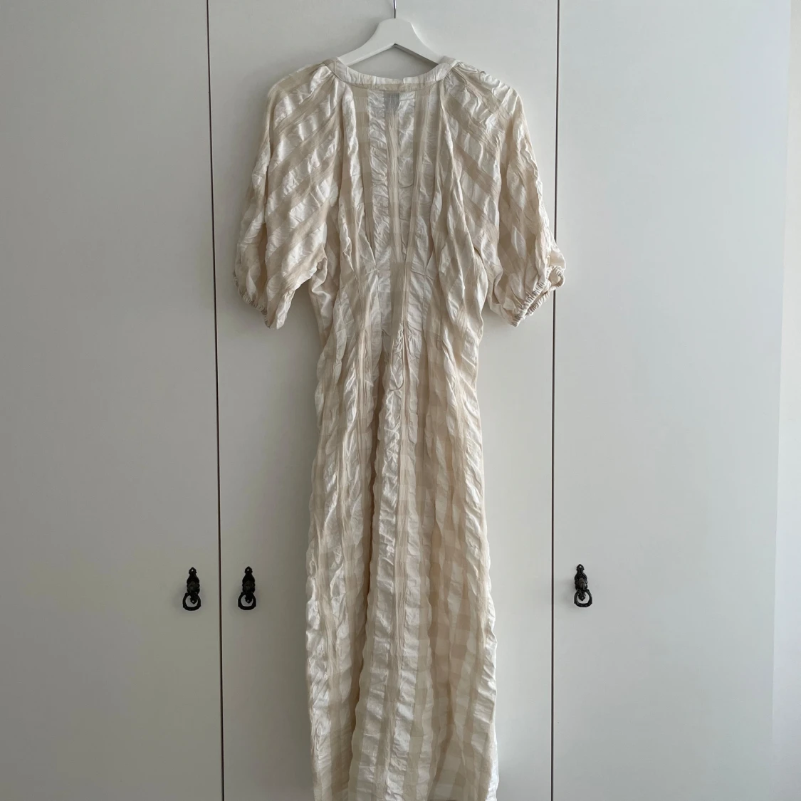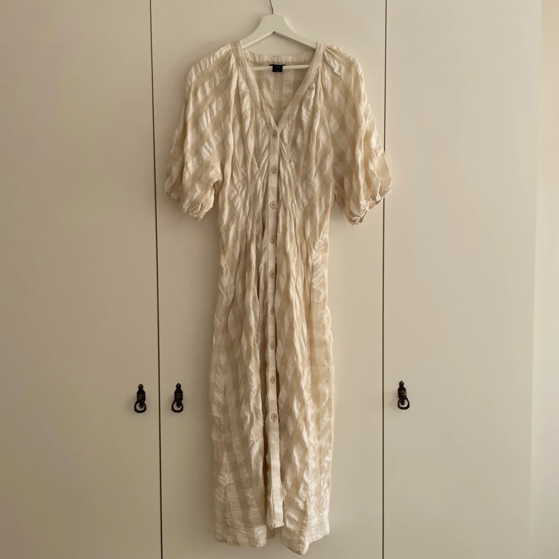 Rutig klänning i beige och vitt. Knappt använd då den är för stor för mig!